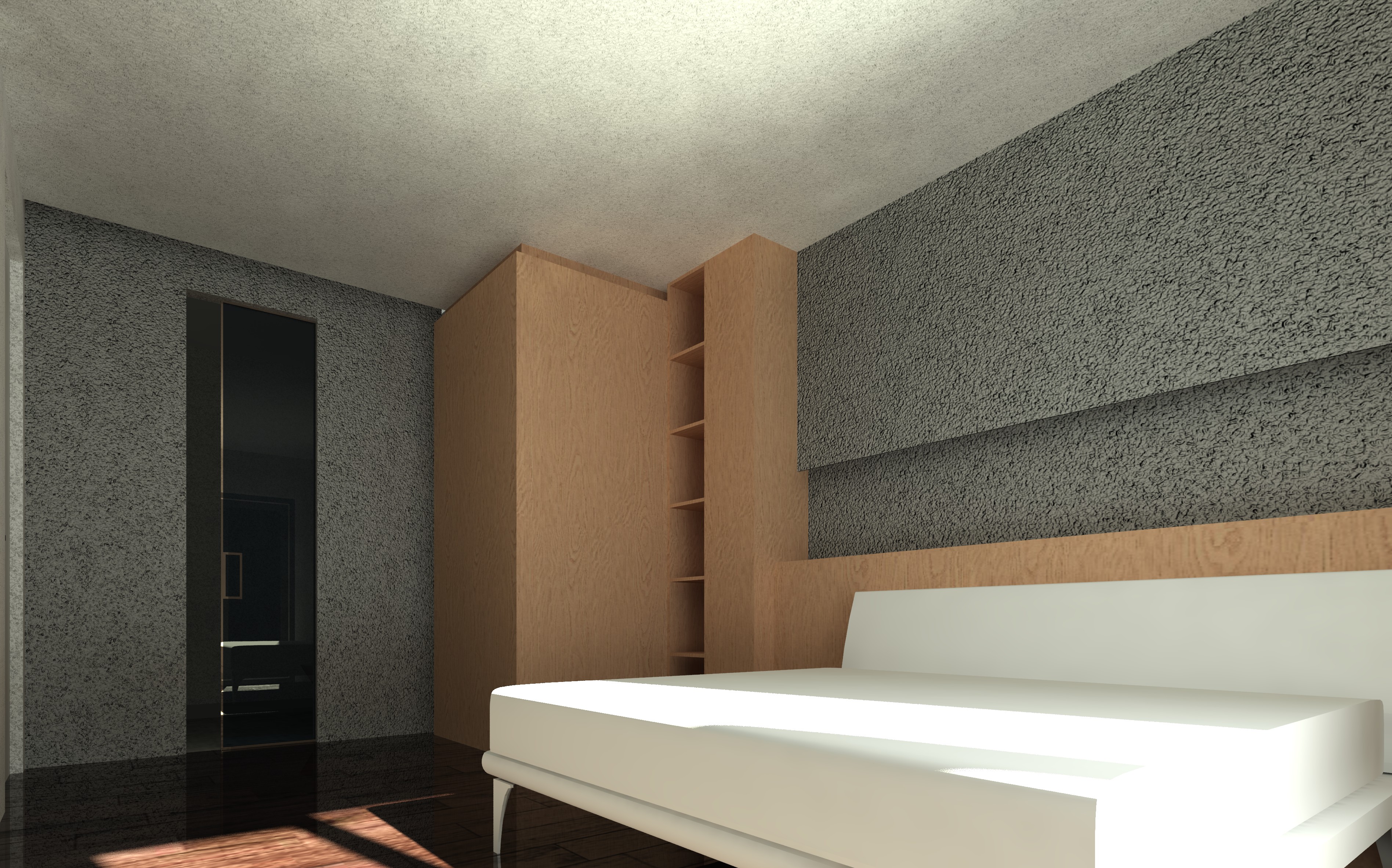 a cozy modern bedroom with textured gray walls and a smooth gray ceiling the wooden wardrobe and shelves are a warm light oak the bed features a sleek minimalist white design the dark hardwood floor reflects natural light enhanced by the soft illumination from a window out of view create a serene inviting atmosphere with a gentle contrast of the warm wood against the cool gray walls balancing light and shadow harmoniously