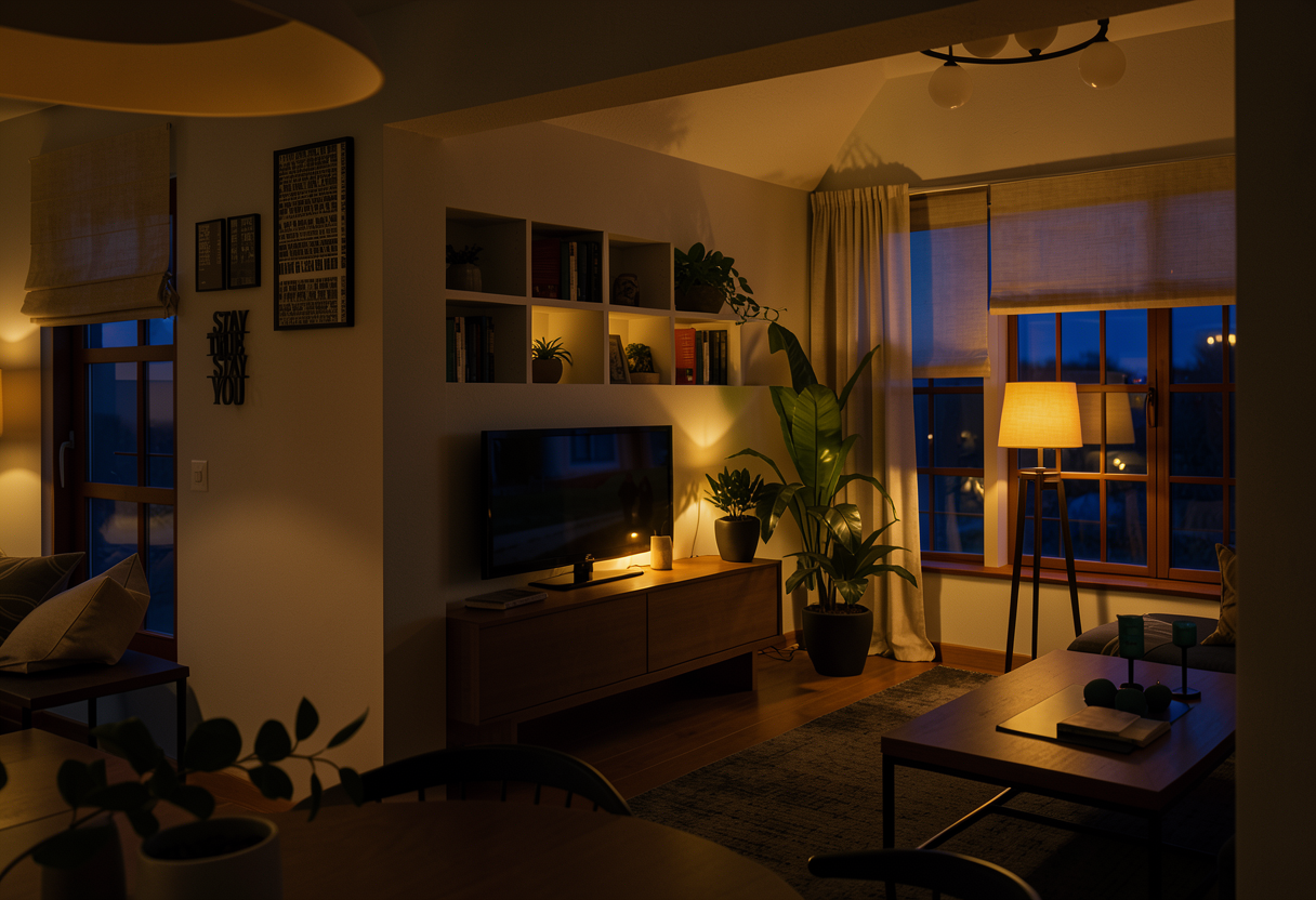 maintain the current image and features and create a late evening version of this same image utilize subtle warm interior and landscape lighting