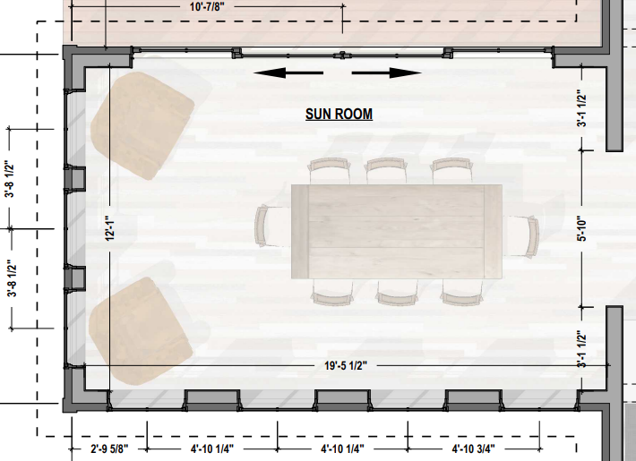 using the floorplan create a sunroom with four equally spaced windows on the left wall three windows on the far wall behind the chairs and sliding glass doors on the right wall going out onto a deck