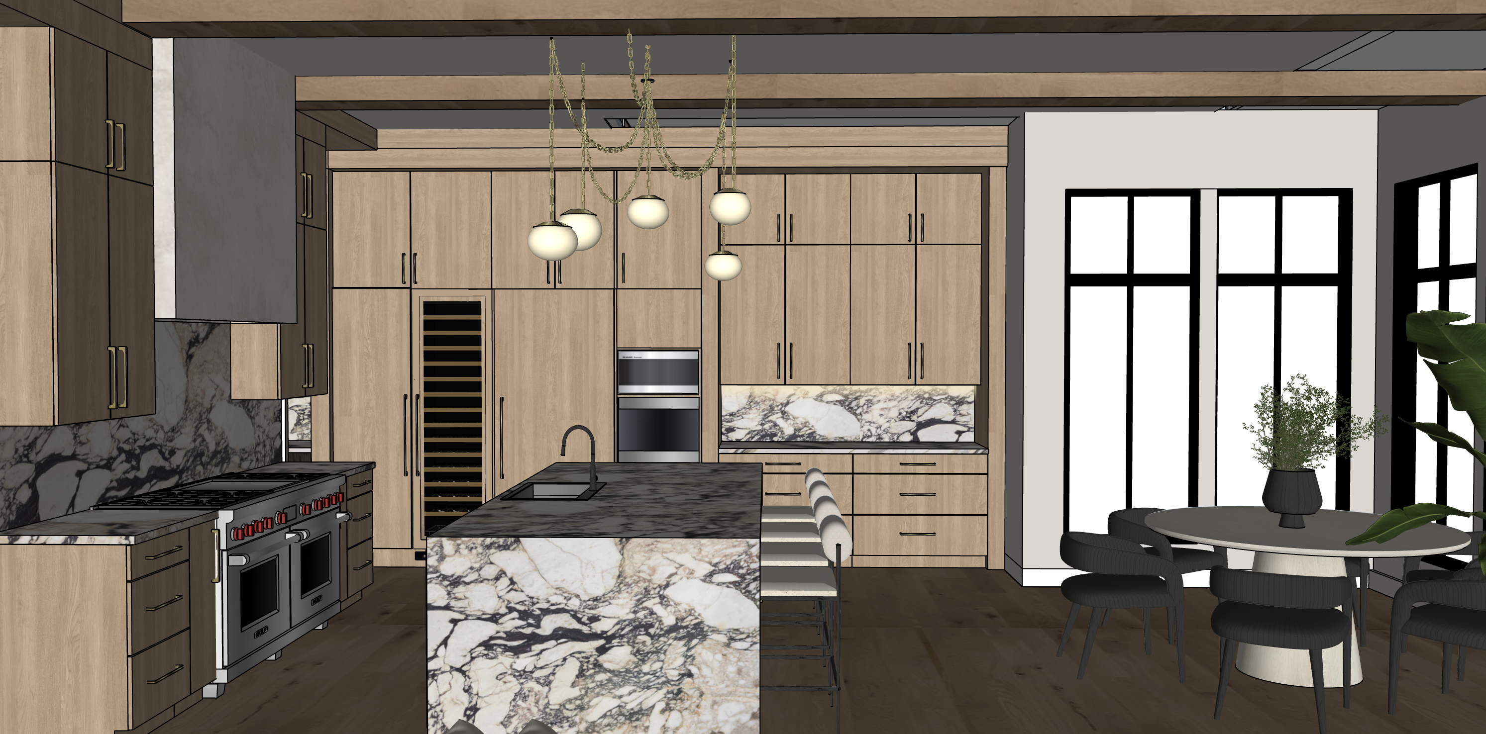 lighter white oak wood under cabinet lighting not on floor no light over circle table windows on 1st floor look out to landscaped yard