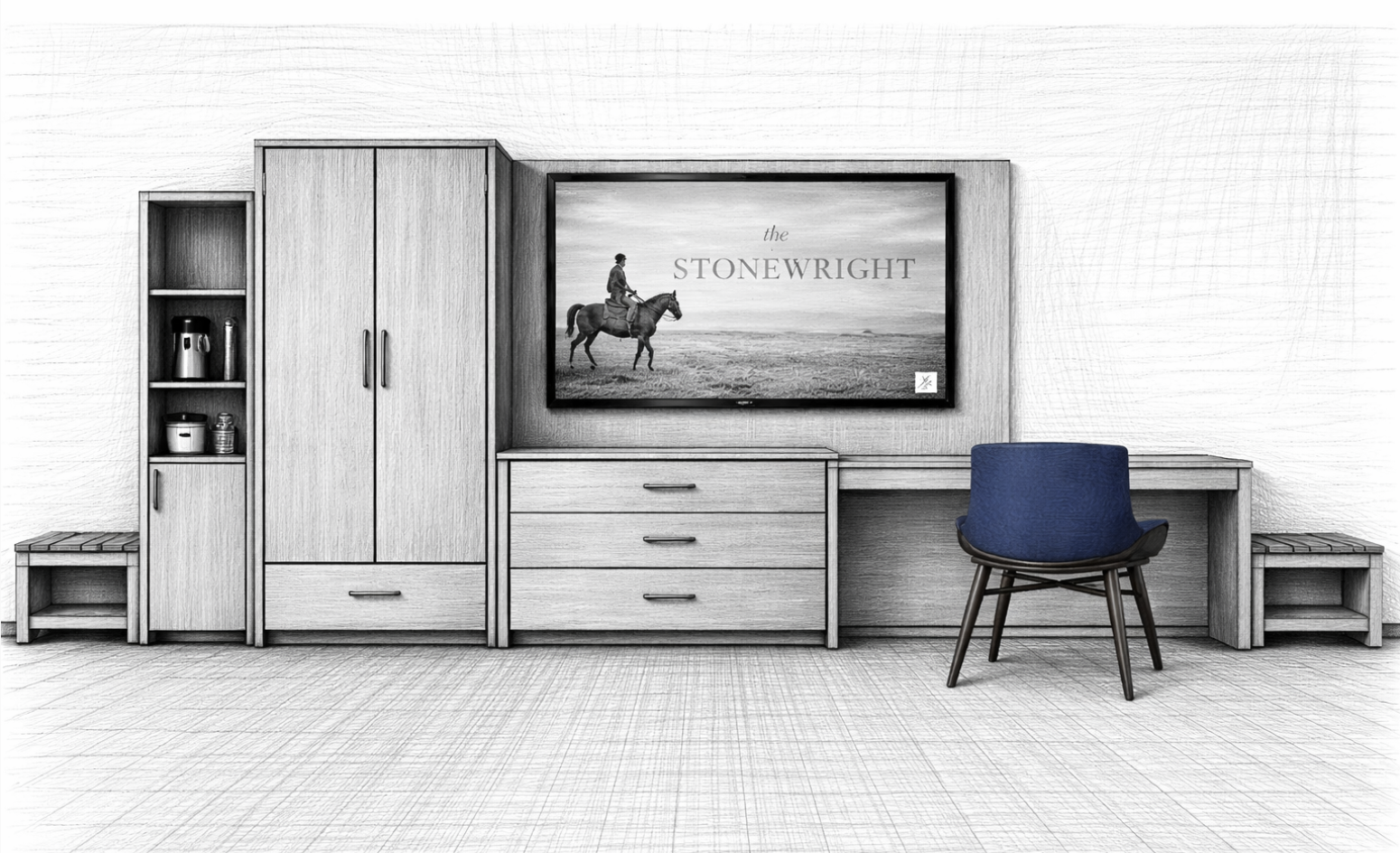 adjust this sketch to remove the luggage rack on the left and make the luggage rack on the right larger center the tv above the desk and dresser