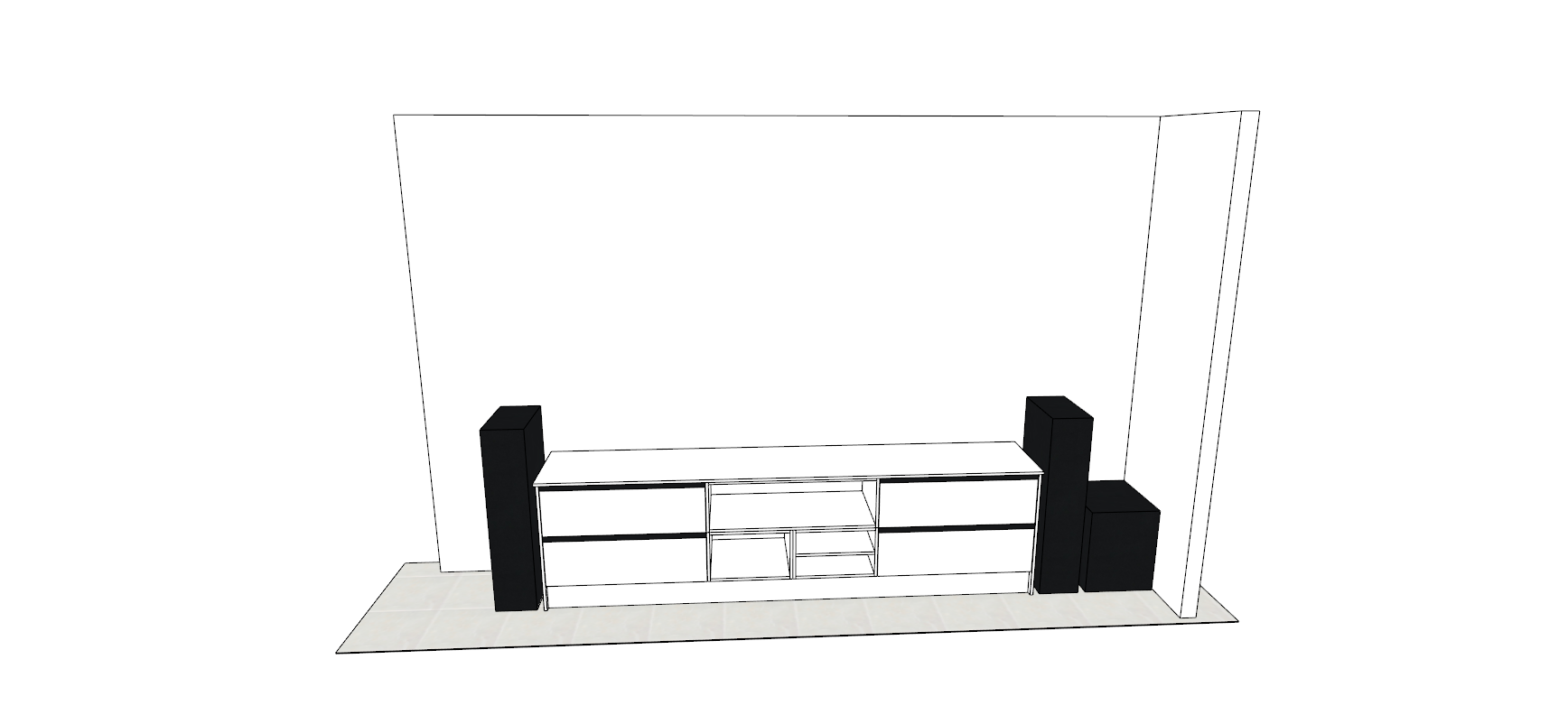 flat white panel doors with sharknose finger pull put a flatscreen tv above the cabintry make the black boxes a surround sound speaker system show some evening sunlight