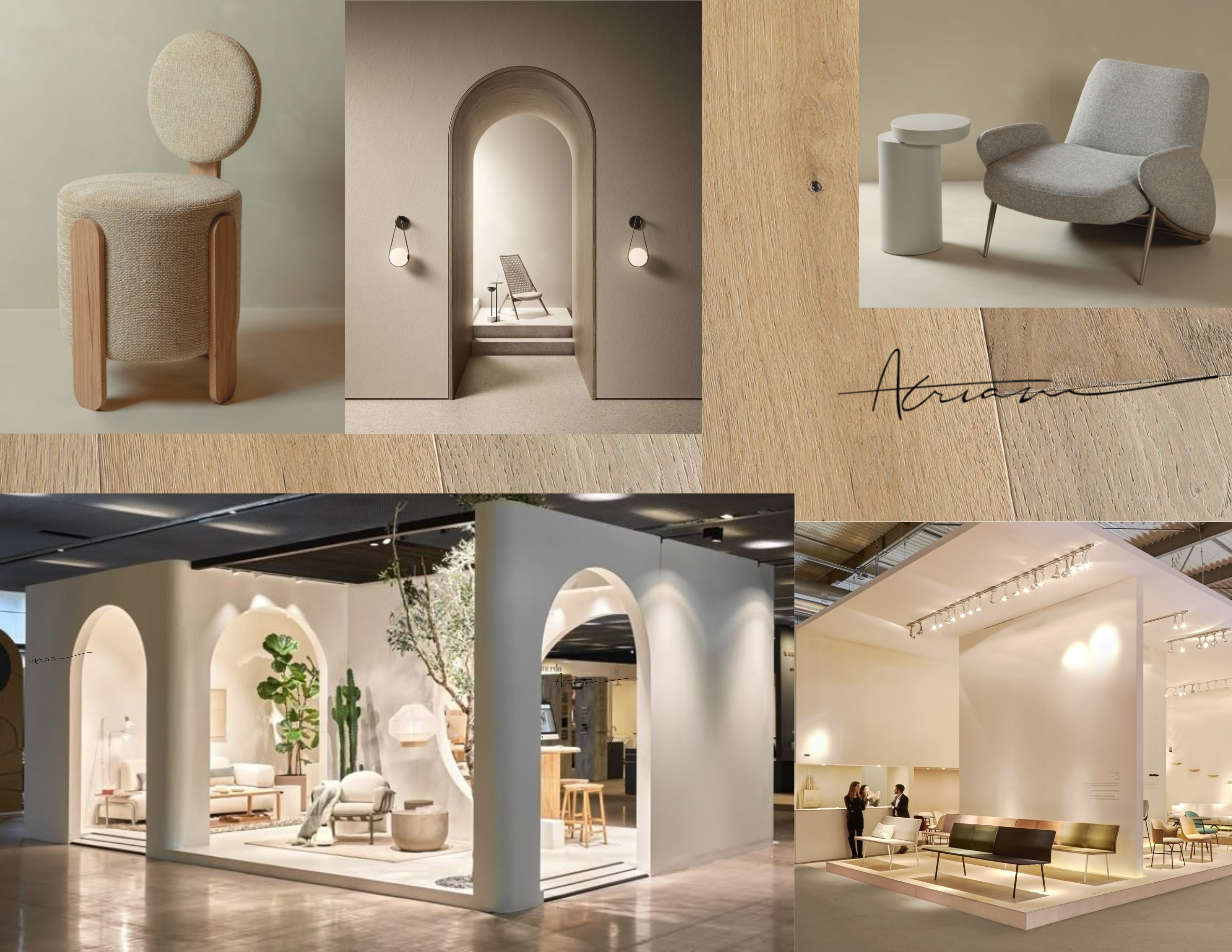 render a luxurious and modern exhibit booth scene featuring a light beige textured chair with wooden legs set against a minimalist backdrop incorporate a spacious framing with multiple corners the atmosphere should be serene and inviting with a color palette of warm neutrals soft greys and muted pinks add sleek contemporary furniture like a grey modern armchair and a minimalist light grey side table highlight the use of light wood flooring for a natural touch create an open concept design with smooth arched doorways leading to various sections and a high ceiling to enhance the spaciousness use elements of indoor greenery to add a splash of life and emphasize the modern aesthetic