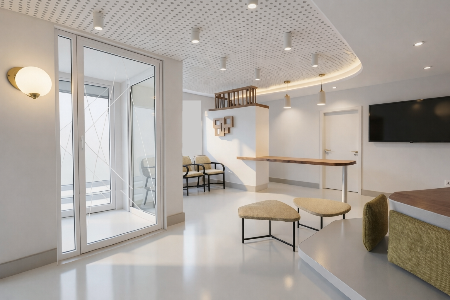create a render in hyper realistic architectural visualization quality 8k resolution all objects furniture architectural features must remain in place do not add any objects or delete anything from the image the spatial configuration must remain unchanged the lights entering are not natural entering