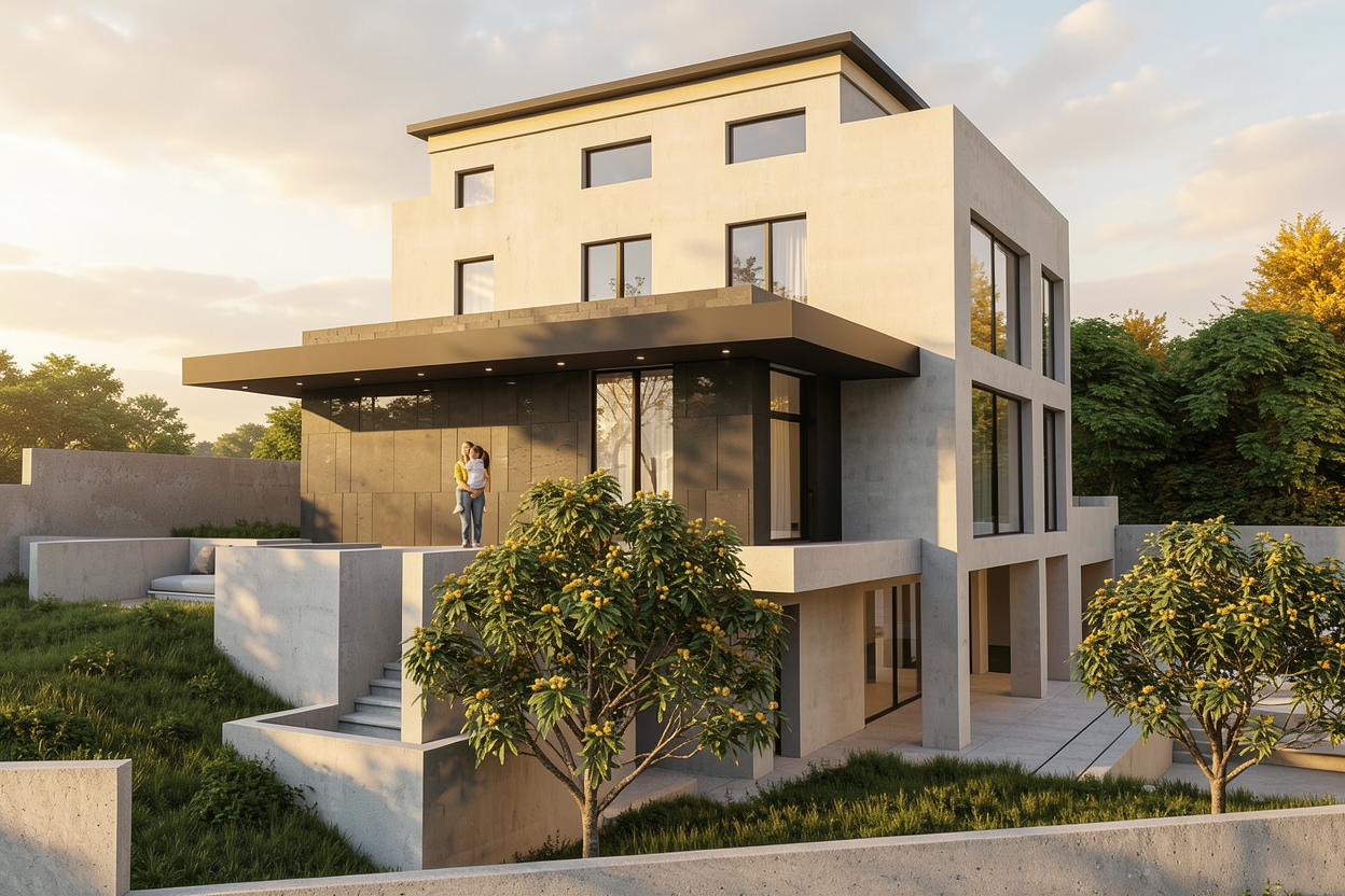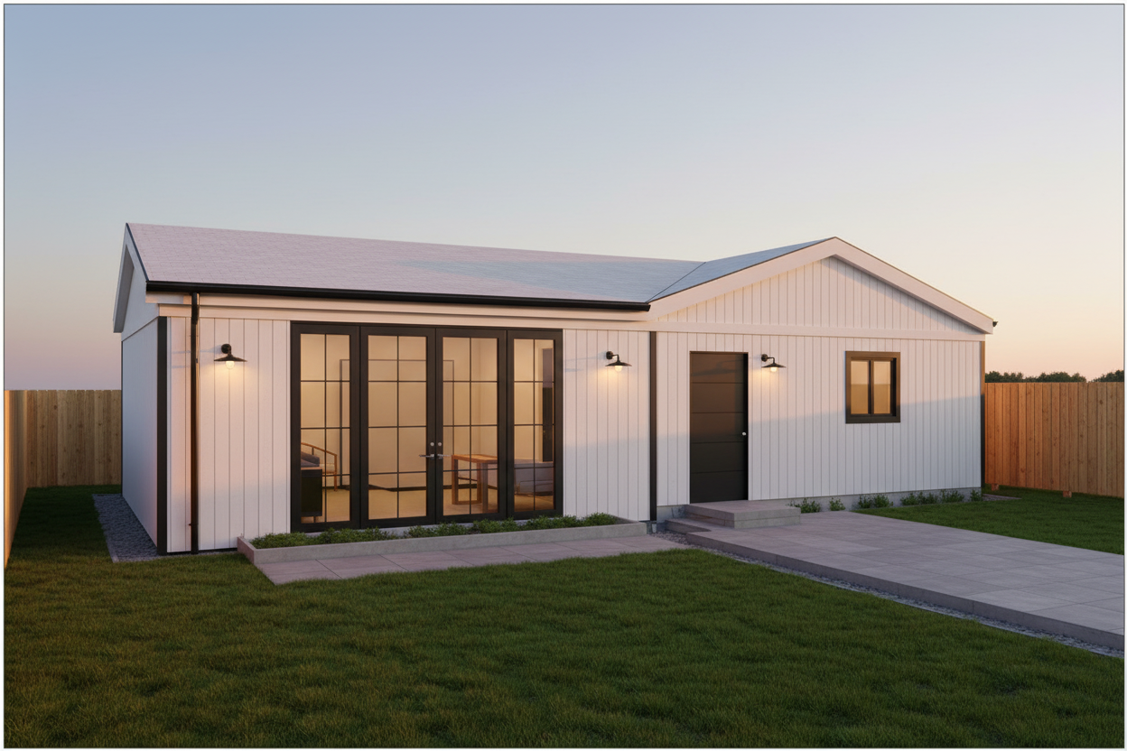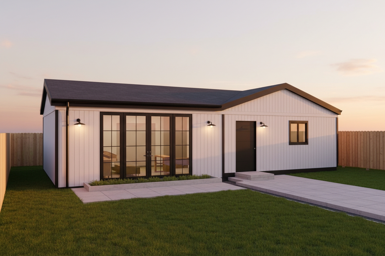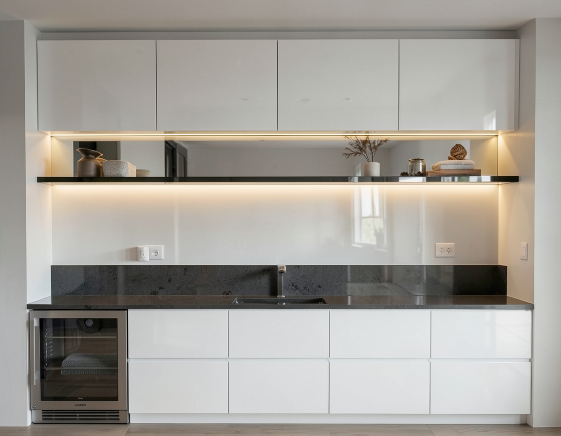 a cozy living room and kitchen with a modern minimalist design the walls are a soft soothing gray a sleek flat screen tv is mounted on the wall above a warm honey colored wooden floor