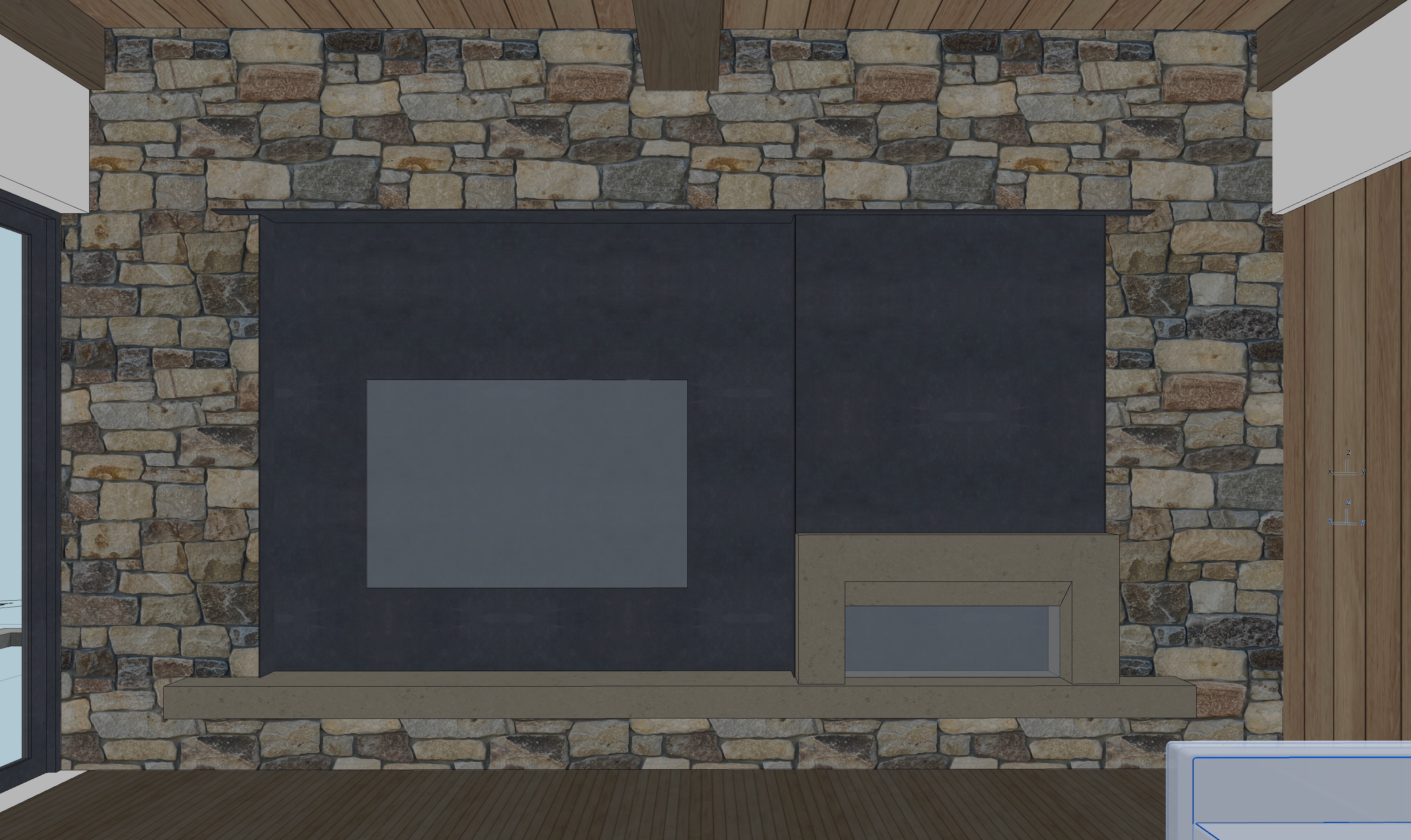 white oak coffee table fabric couch fireplace with fire surrounded by concrete mantle and fireplace surround