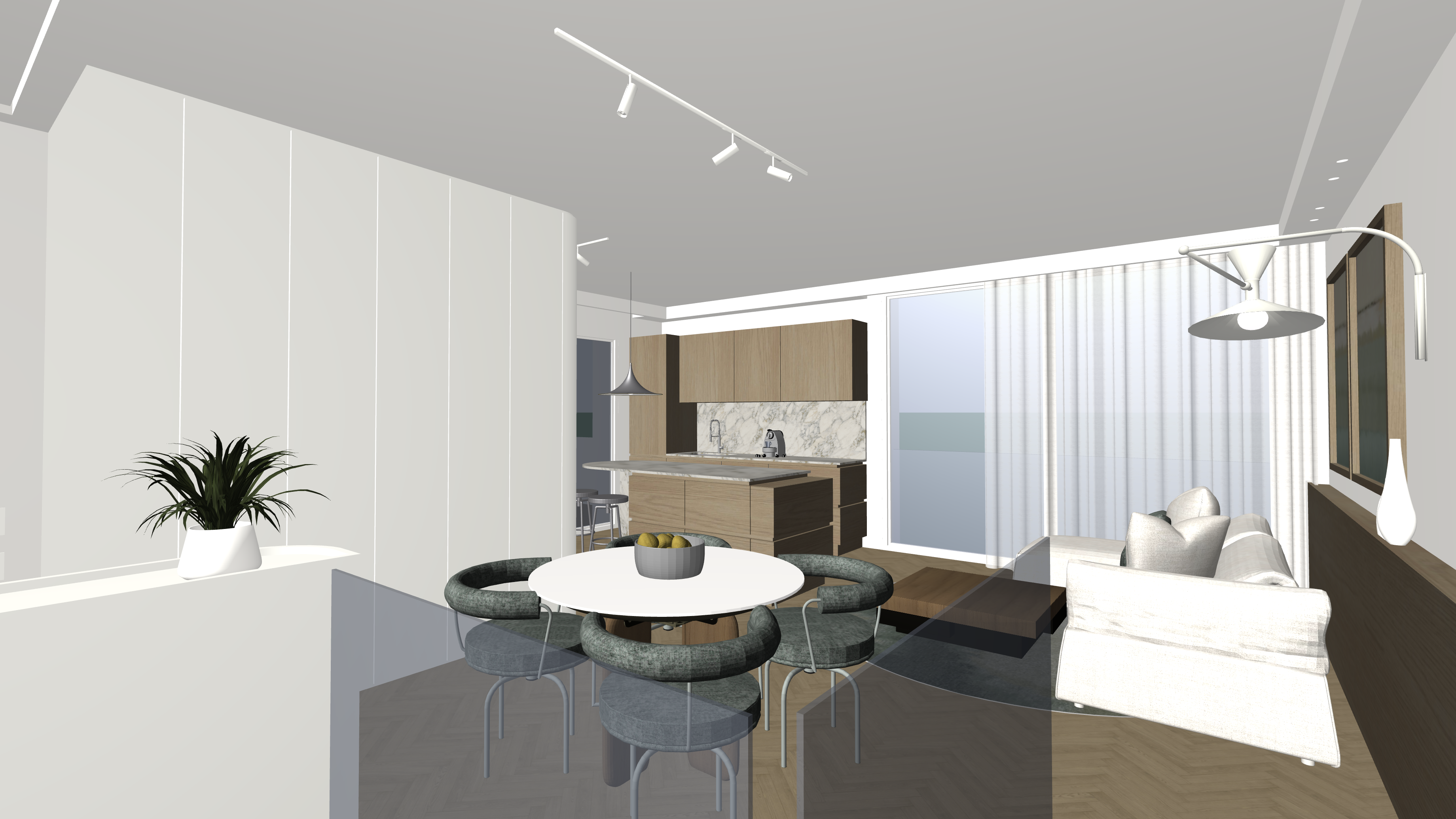 zona giorno con mobili in bianco caldo e in legno rovere naturale le pareti sono tinteggiate di bianco a soffitto abbiamo un binario bianco con faretti bianchi accesi con luce calda sopra la tavolo dietro al tavolo abbiamo un parapetto in vetro trasparente la boiserie in legno rovere naturale sulla destra ha una strip led incassata nella parte superiore che emette luce verso l alto sopra ai quadri ci sono dei faretti incassati a fianco dei quadri abbiamo una lampada a parete accesa la cucina ha un piano in marmo venato e una strip led sotto i pensili l isola della cucina ha una lampada a sospensione cromata ed accesa metti una strip led nella veletta in cartongesso sopra alla tenda in tessuto leggero fai entrare un p di luce naturale dalle portafinestre e metti uno sfondo di un terrazzo con delle piante e vista mare in lontananza metti qualche oggetto di una zona giorno