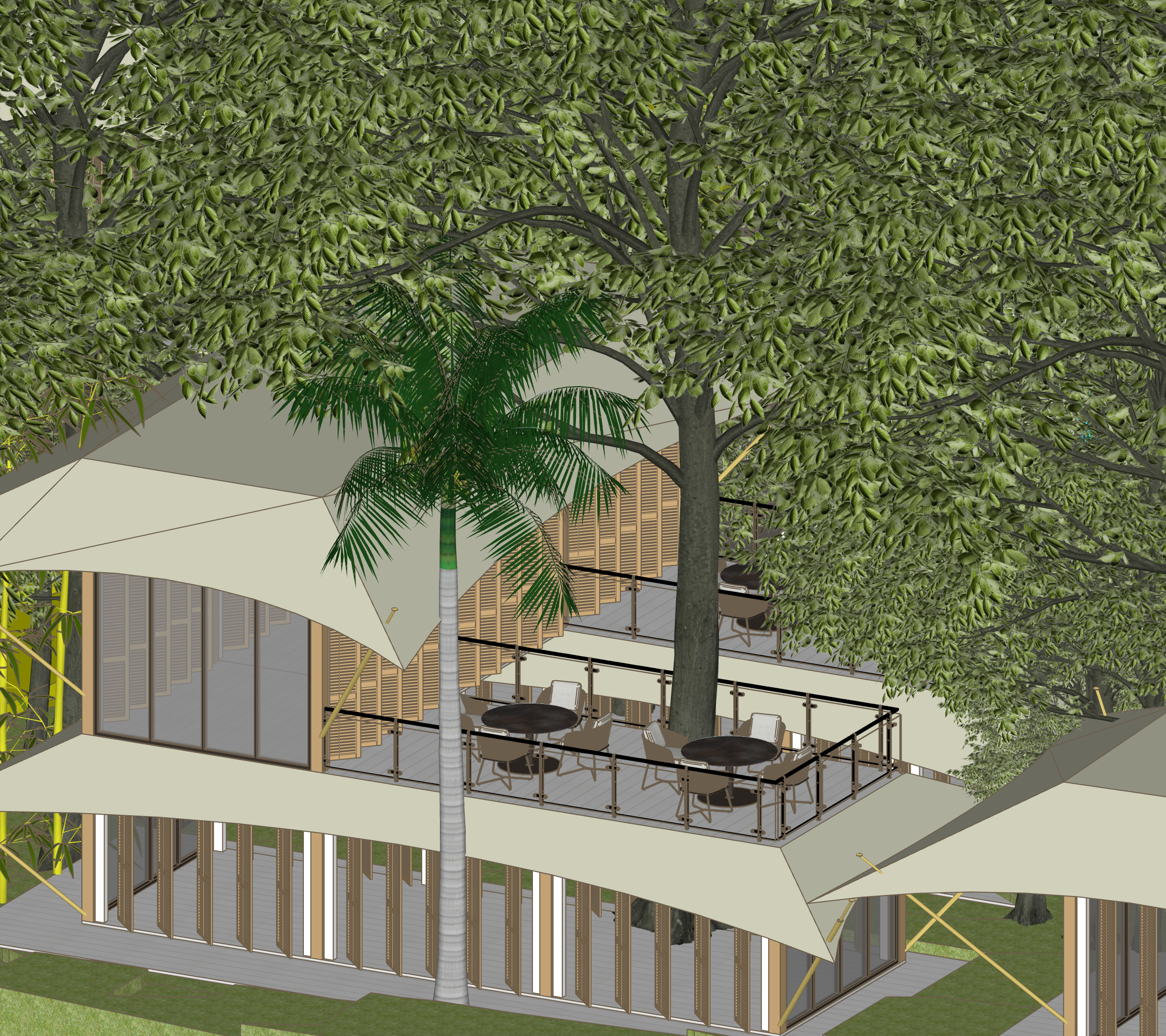 archsynth close aerial render gliding just above the tent roofs do not modify or move any building elements from the raw 3d drawing emphasize roof texture realism fabric grain stitching lines soft highlights and the structural rhythm of wood columns beneath include dense trees encircling the buildings with partial visibility of the narrow front road and the small river at the lower slope keep lighting warm and natural