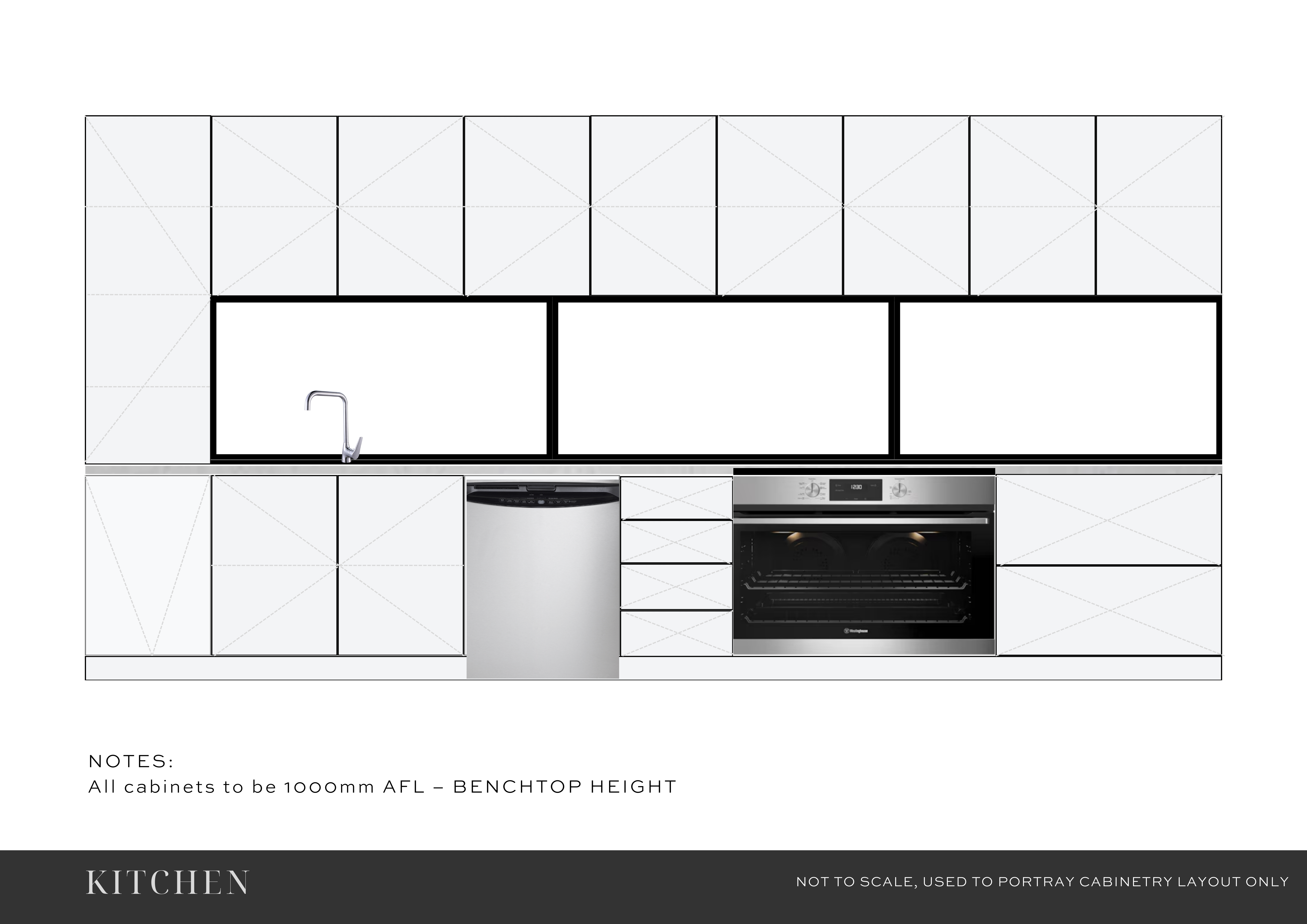 create a clean architectural kitchen elevation rendering from the provided drawing maintain the exact cabinet layout proportions spacing and alignment from the elevation do not redesign move resize or reinterpret any cabinetry or appliances the rendering must remain a flat 2d orthographic elevation view requirements perfect front on orthographic elevation no perspective no 3d angle no camera depth the image should read as a professional architectural joinery elevation materials cabinetry soft grey finish matte polyurethane drawer fronts include slim brushed brass bar handles benchtop light grey marble look stone benchtop with subtle veining splashback splashback window with thin black frame sink and tapware apron front farmhouse sink with brushed brass gooseneck mixer appliances centered cooktop below the splashback window wall area built in wine fridge on the right side with glass door and timber shelving rendering style professional architectural joinery elevation clean linework subtle realistic materials minimal shadow white background clear cabinet outlines similar to high end kitchen joinery shop drawings used in architectural presentations quality high resolution ultra crisp linework soft material realism architectural presentation quality critical instruction remove construction lines and x marks in cabinet panels while keeping all cabinetry and appliance placement exactly the same the image must remain strictly a flat 2d elevation drawing pro tip very powerful add this line to the end if the ai keeps trying to make it 3d render as a technical architectural joinery elevation sheet not a 3d rendering
