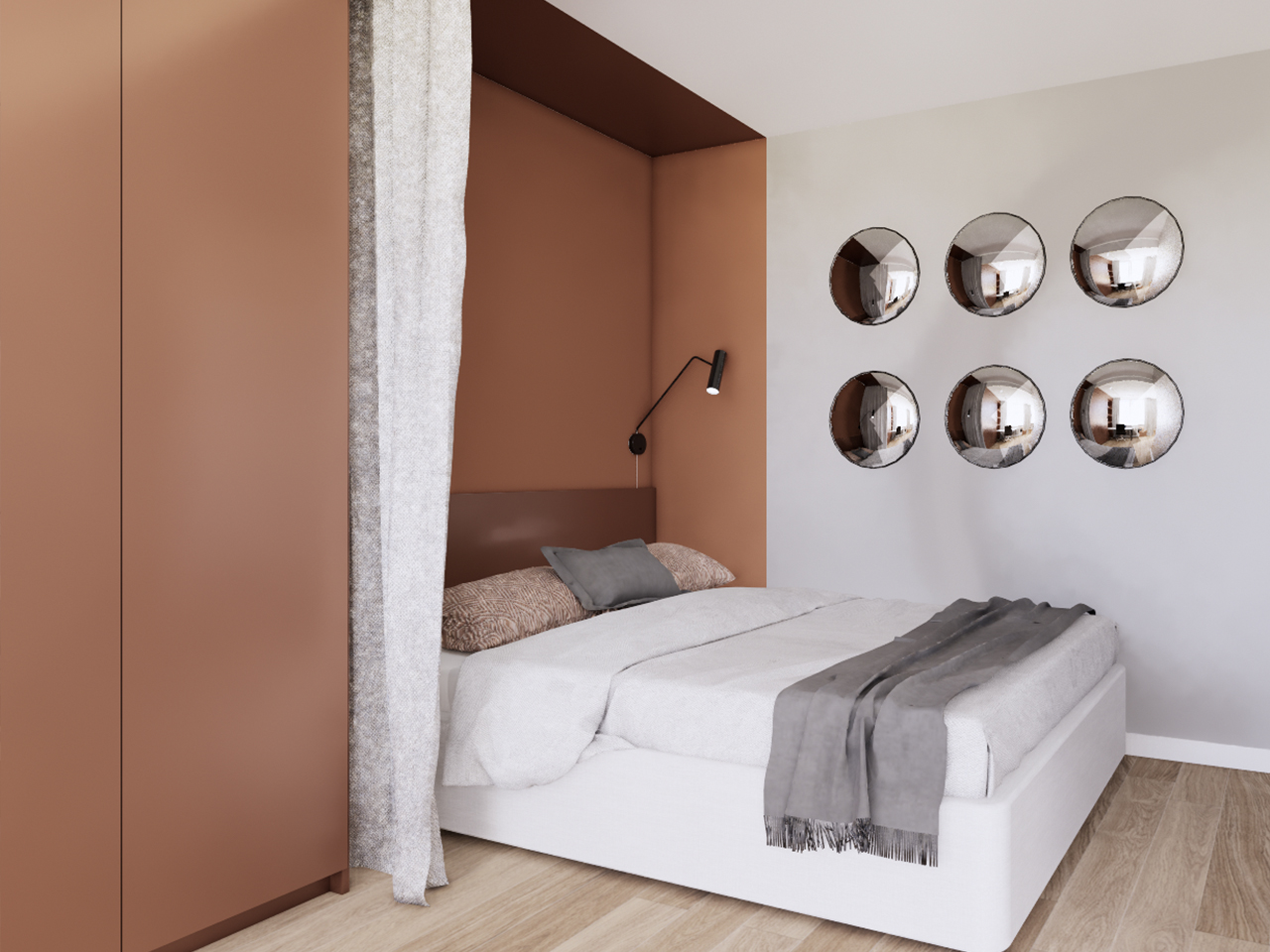 international style interior shot modern minimalist living room with a built in wall unit and shelving a dark fabric sofa and a small round wooden coffee table keep the exact same layout composition furniture placement and overall design change the dominant wall and cabinetry color to a muted burnt green earthy desaturated green tone extend this same green color to the wall in the bedroom area where the bed is visible so that it matches the living room and creates a cohesive unified space maintain a minimal aesthetic with very few decorations and clutter keep soft natural lighting neutral curtains and wooden flooring preserve the original materials proportions and camera angle any mirror reflections must be fully consistent with the room accurately reflecting the same colors lighting and elements for a coherent and realistic look subtle realistic textures high end interior design style clean and calm atmosphere architecture