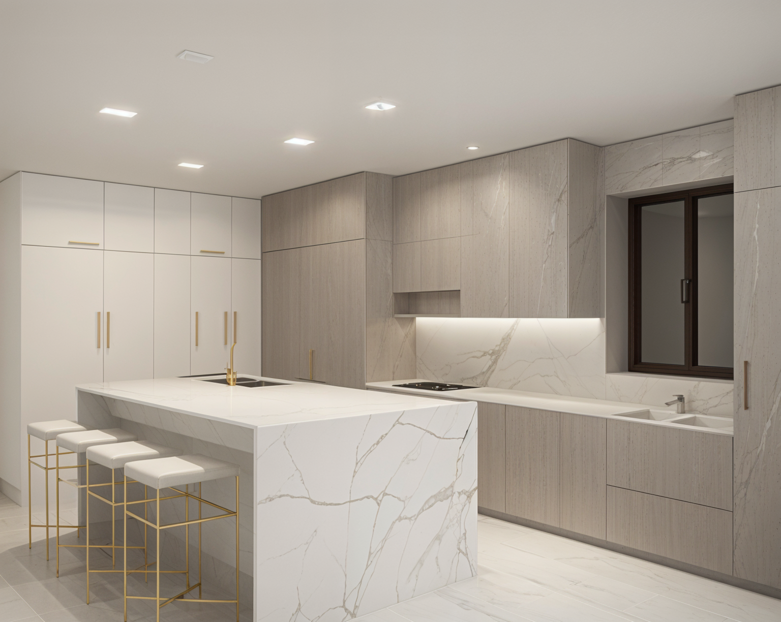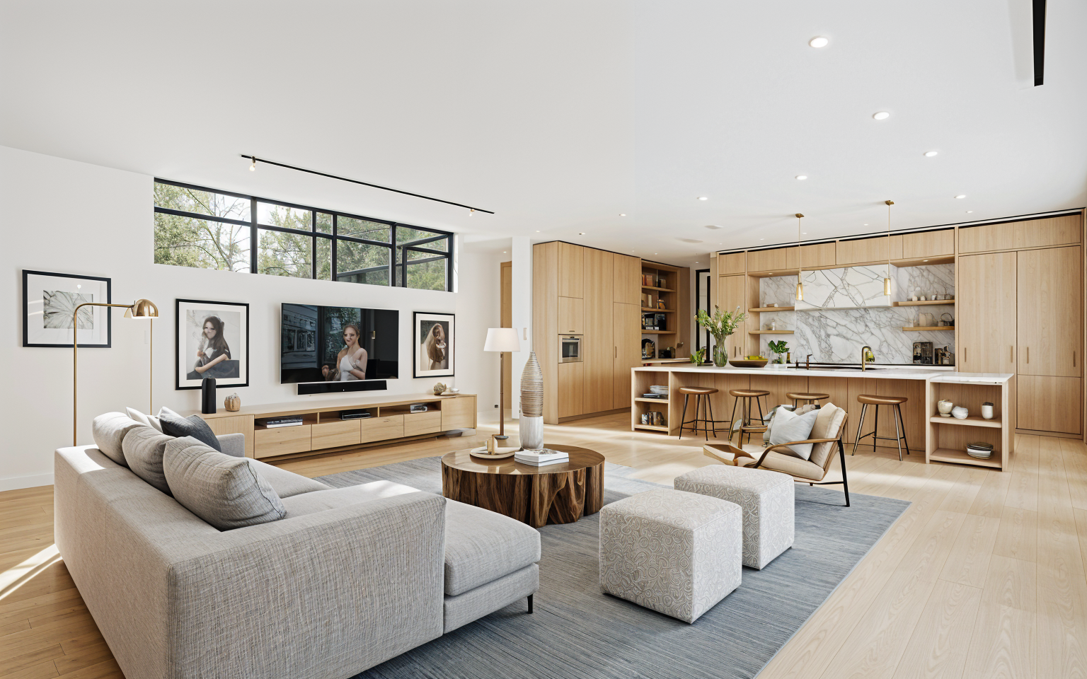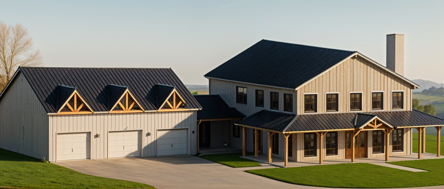 modern farmhouse with a large main building and an adjacent garage accentuating a rustic yet elegant charm render the roof with a sleek charcoal gray color for a contemporary touch the main walls are a subtle light gray with vertical paneling creating a sense of openness and lightness the windows are elegantly framed in contrasting black adding depth and sophistication the porch features warm wooden posts with soft golden tones adding warmth and inviting appeal the garage doors are a crisp white harmonizing with the overall serene and clean look of the property set the atmosphere in early morning light where the first rays of sunlight gently illuminate the scene casting soft shadows to enhance the tranquil and peaceful ambiance