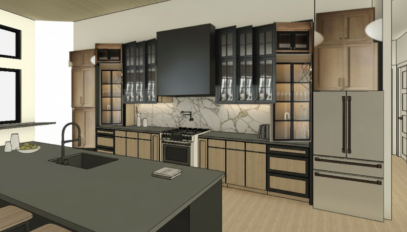here is the comprehensive plan to elevate this concept into a photorealistic masterpiece phase 1 proportional accuracy spatial correction the current image suffers from distorted perspective particularly in the upper right cabinetry and the floating nature of the glass cabinets to fix this in the 3d model grid alignment snap all base and upper cabinets to a strict architectural grid the upper glass front cabinets flanking the hood must be perfectly plumb with the base cabinet outlines depth correction the refrigerator housing far right appears flat ensure the fridge surround is pulled forward to a standard 25 30 depth allowing the counter depth fridge to sit flush with the cabinetry island proportions the island currently looks slightly skewed ensure a standard 36 height the overhang for the seating area bottom left should be precisely 12 to 15 to look structurally sound and realistic hood scale the hood is currently a massive flat block give it subtle tapers or architectural reveals at the bottom edge to give it weight and purpose rather than looking like a pasted rectangle phase 2 physically based rendering pbr material specifications to achieve true photorealism we must move away from flat colors and use pbr materials with albedo roughness and normal bump maps 1 the black elements hood upper lower cabinets finish matte black fenix ntm or a high end matte painted wood 3d parameters albedo very dark charcoal not absolute black rgb 20 20 20 roughness 0 45 soft diffused reflections that won t show harsh glare normal map a very subtle orange peel texture to simulate sprayed cabinet paint execution linking the material nodes for the hood and the black cabinet frames will ensure 100 color and reflective consistency under all lighting conditions 2 the oak cabinets finish rift cut medium to light white oak rift cutting ensures straight modern grain patterns rather than the arching cathedral patterns of cheap oak 3d parameters albedo warm natural tan wheat roughness 0 35 satin polyurethane finish bump map follows the grain lines to catch micro shadows 3 the backsplash finish honed calacatta gold marble 3d parameters add a slight subsurface scattering sss node to the marble to give it that authentic slightly translucent depth characteristic of real stone the veining should feature thick organic grey strokes with subtle warm gold undertones to bridge the black cabinets and the warm oak 4 countertops finish matte charcoal soapstone or honed dark quartz to ground the island and perimeter contrasting beautifully against the white marble backsplash phase 3 advanced lighting atmosphere lighting is what separates a basic 3d model from a photorealistic image global illumination hdri use an overcast or soft morning hdri environment map outside the windows left this will cast soft diffused natural white light across the island and reflect gently off the glass cabinet doors artificial fill lighting under cabinet lighting add invisible led strip lights color temperature 3000k warm white tucked under the upper cabinets this will wash down the calacatta marble highlighting the veining and creating a cozy high end atmosphere interior cabinet lighting place soft low intensity point lights inside the glass front cabinets to highlight the glassware and add depth to the dark frames