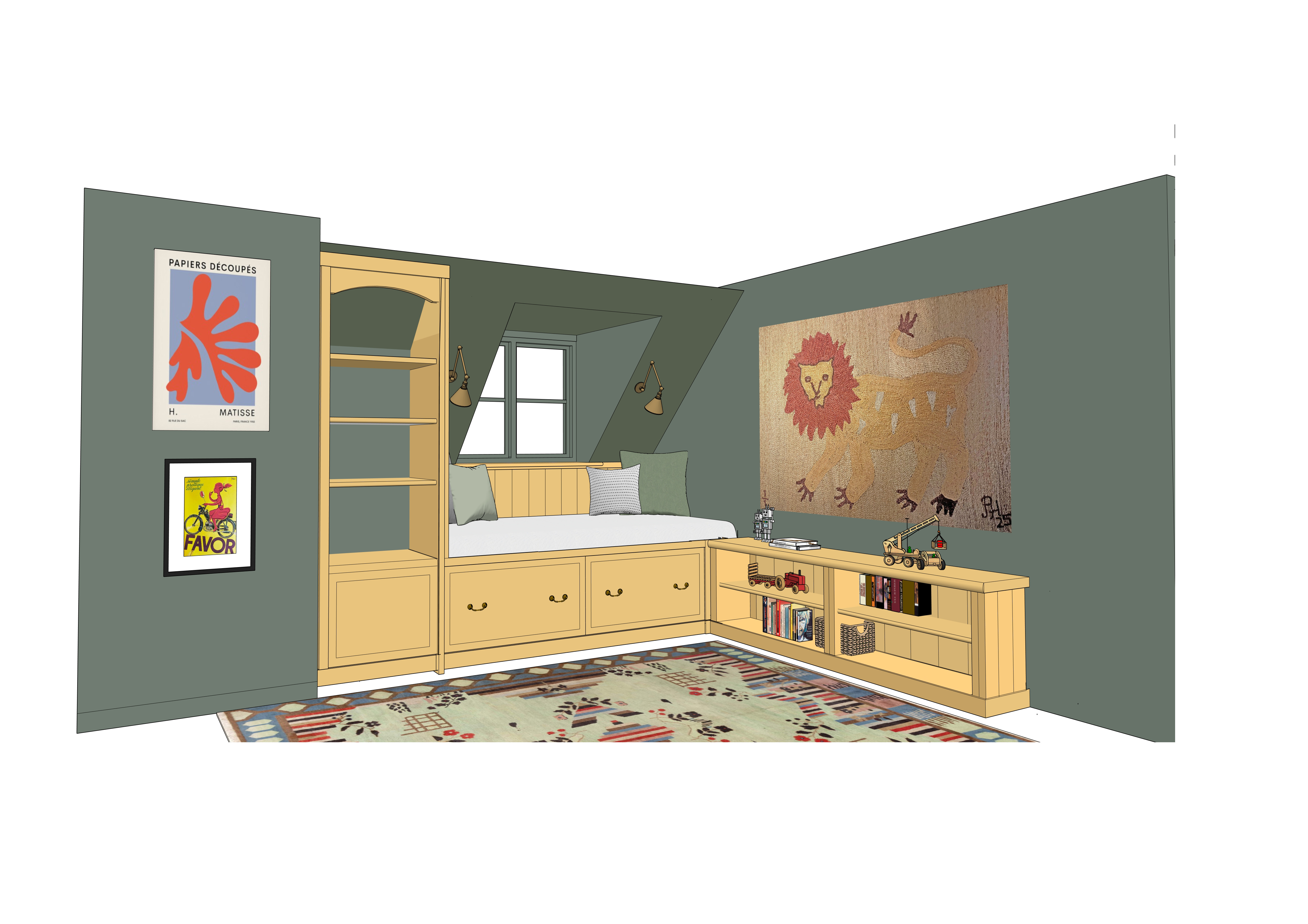 create a photo realistic render from the provided image include mood lighting to bottom of shelves morning light through window