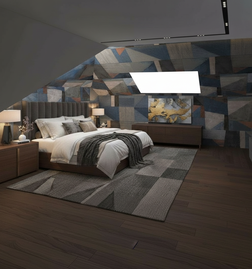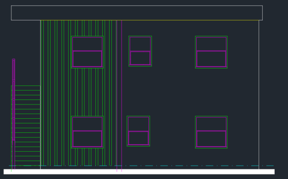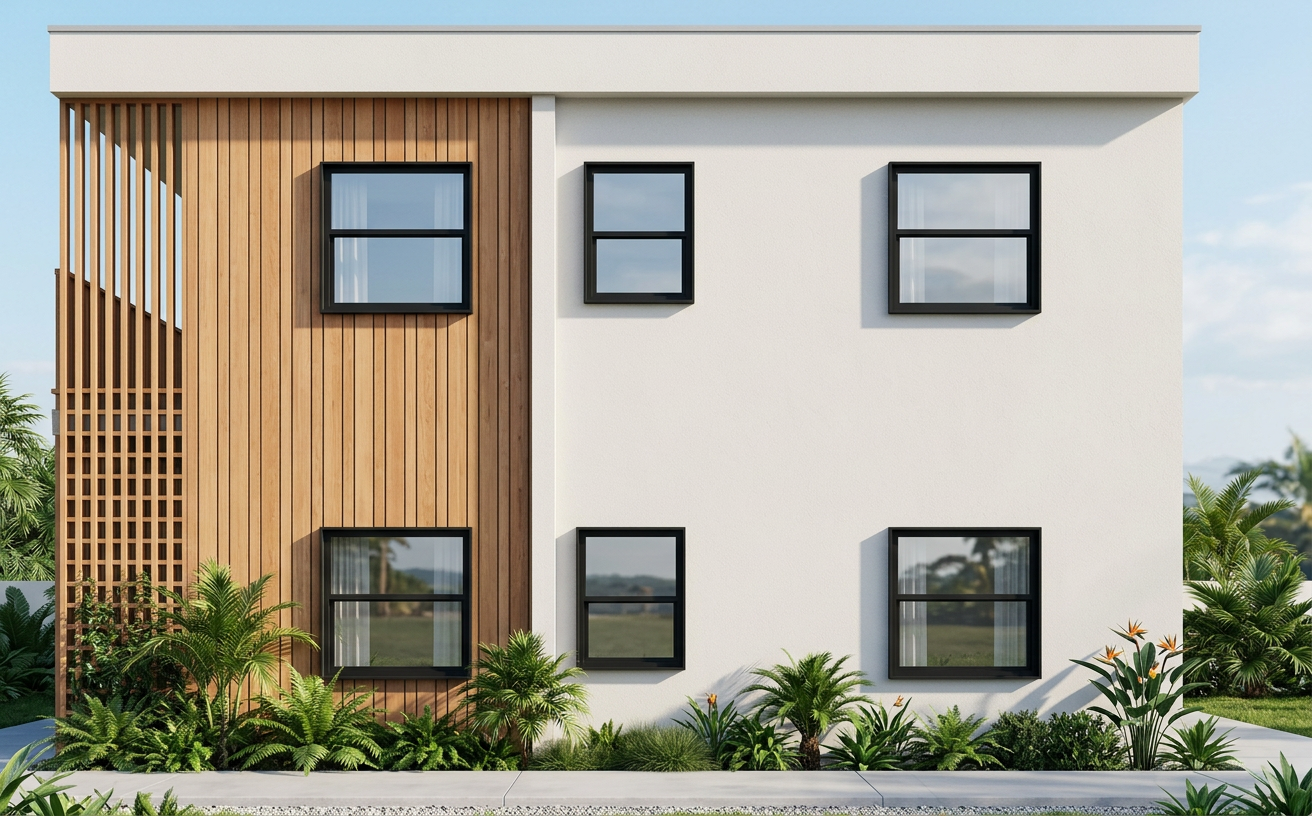 this is a front elevation of a two story building pearl stucco exterior walls black window frames natural wood strips color keeping clean the stairs to second floor balanced modern composition soft blended tropical landscaping clean outdoor environment natural daylight convert this image into realistic render