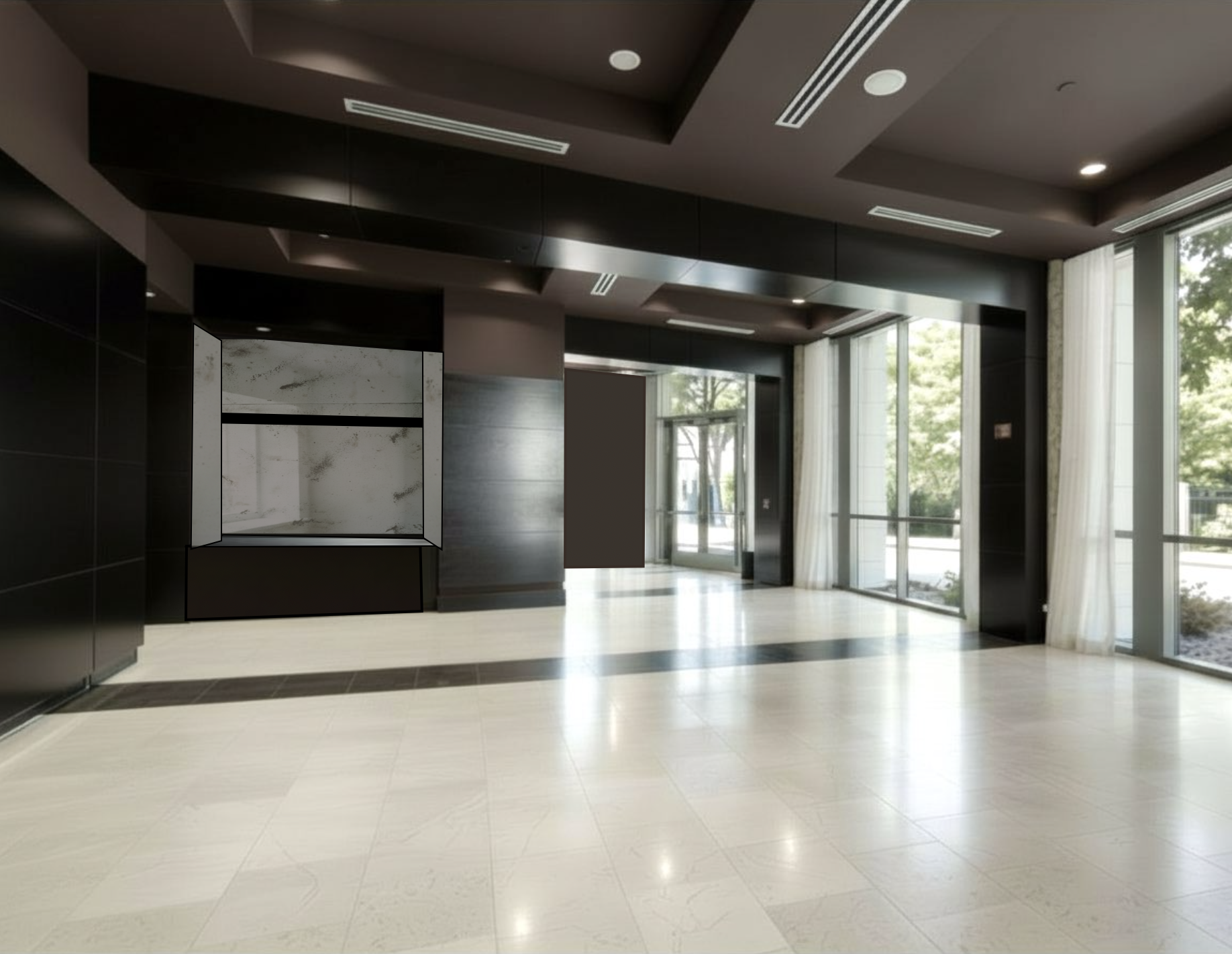 make the white curtains a brown velvet fabric instead of sheer linen but make them hang straight not tied back and not closed shut