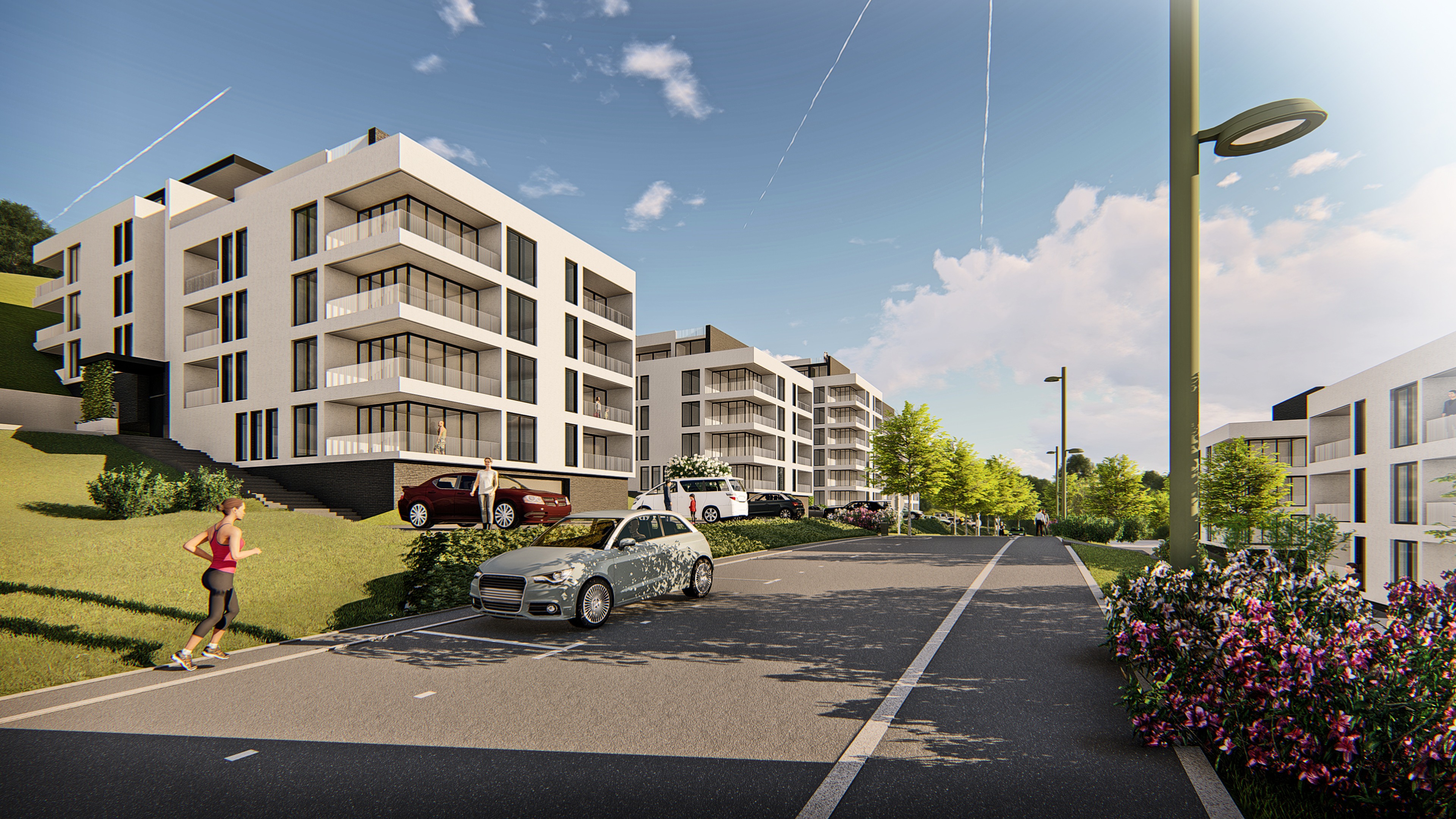 important preserve the existing geometry and the existing context exactly as provided do not modify alter reinterpret add remove scale or reshape any geometry do not change the site surroundings street layout neighboring buildings vegetation or context elements do not modify geometry scale proportions buildings road layout sidewalks or surrounding context in any way do not change text photorealistic architectural rendering clean and balanced contrast calm cinematic mood style contemporary european residential architecture minimalist premium understated include people subtle motion blur for realism do not add new people do not change the green space do not change the sidewalk do not change the road add reflection of the sorroundings to the windows remove the people
