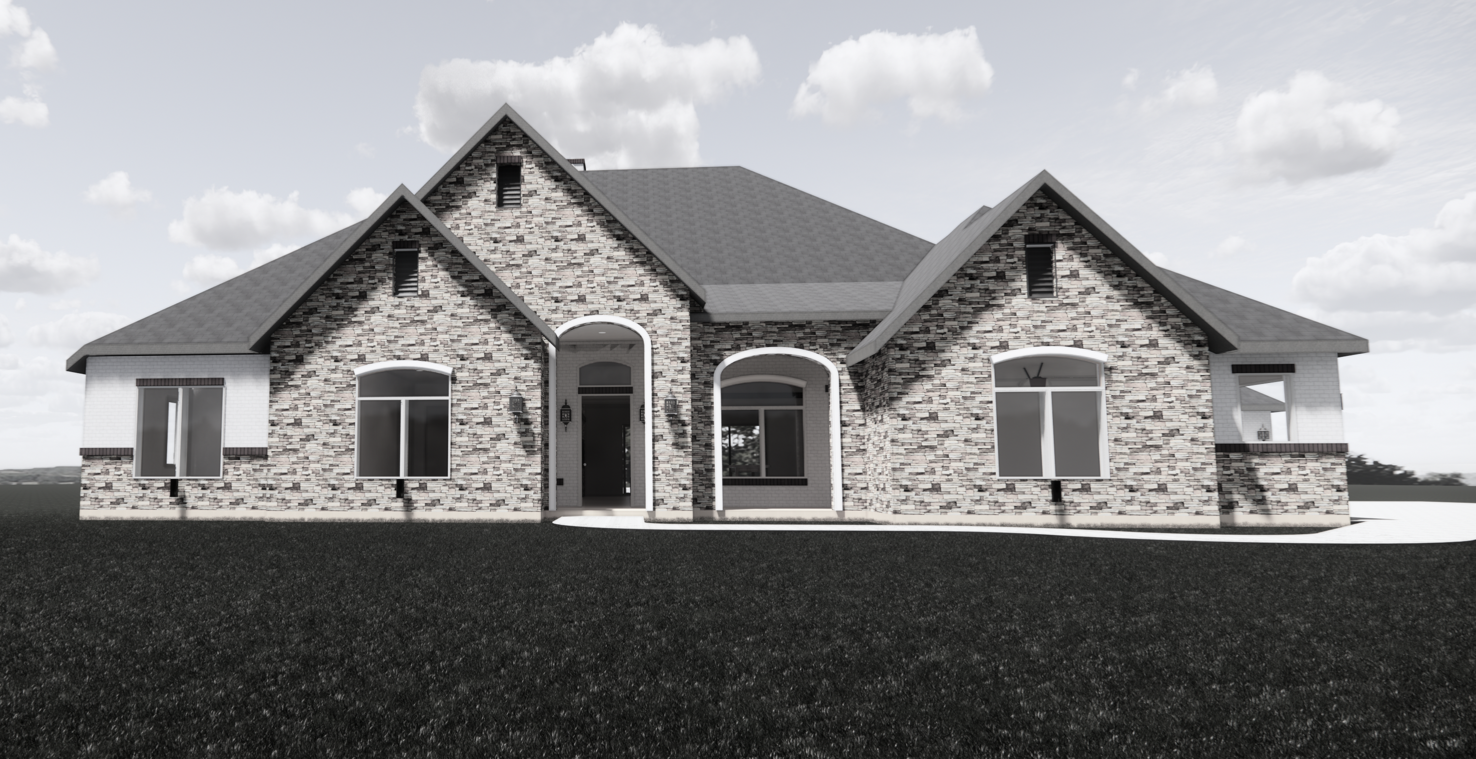 overcasted day larger creamy limestone wet concrete warm lights in windows bronze window frames lots of trees and landscaping black roof dark trim