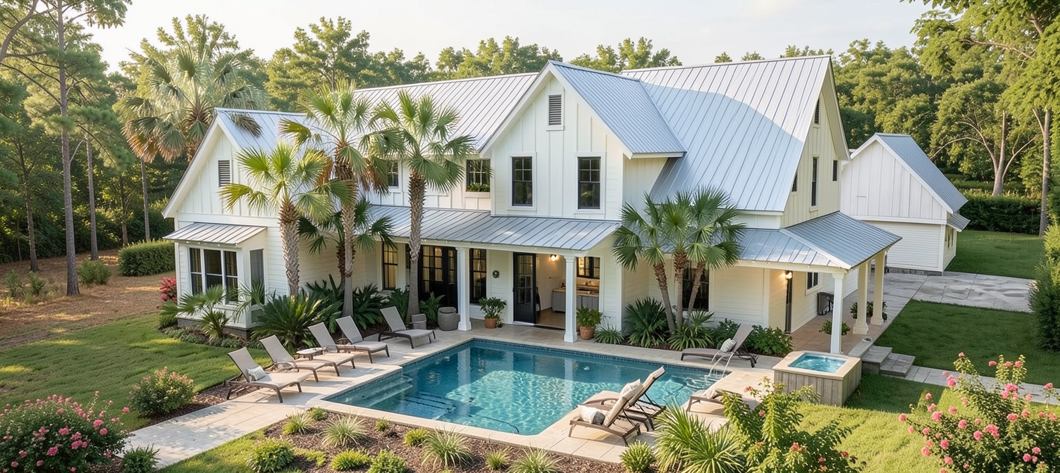 white lap siding throughout with white board and batton roof peaks black roof in forest with a side loaded driveway