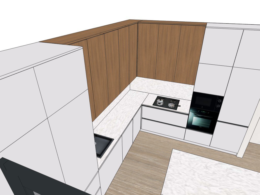 kitchen interior with a modern minimalist design use a snoji white sw color the walls countertop should be porcelain grey beige slight structured the kitchen should feature mate cashmire cabinetry and upper cabinets should be egger oak brown casella the oven and stovetop are sleek and contemporary in a reflective black finish the flooring is a warm neutral light oak wood enhancing the cozy atmosphere the atmosphere is clean modern and welcoming