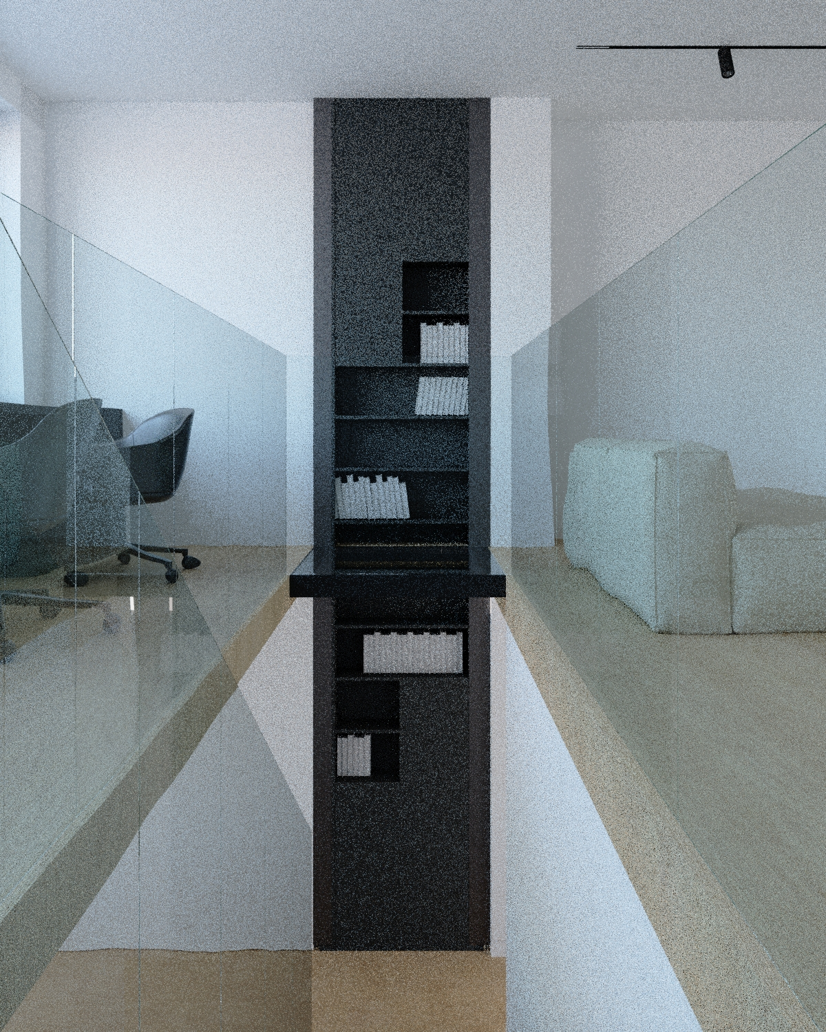 render a modern interior with a high ceiling and glass railings creating an open airy atmosphere the floor is a light wood tone providing warmth the walls are crisp white for a clean minimalistic look a black office chair and a sleek beige sofa add contrast in the space the central column is dark grey adding a bold focal point while the bookshelf is black and filled with neatly arranged white and grey books soft natural light floods the room from large windows enhancing the calming and spacious feel the cabinet doors are made of black glass and all the shelves are filled with books and led lighting