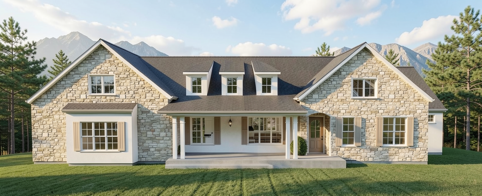 generate beautiful elevations renders with light inside with white stucco on front walls and black tile roof top down from above with sunlight at dusk