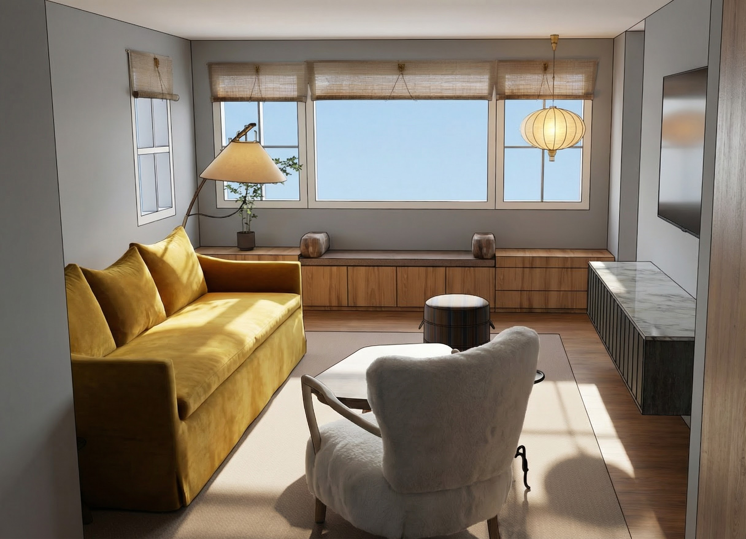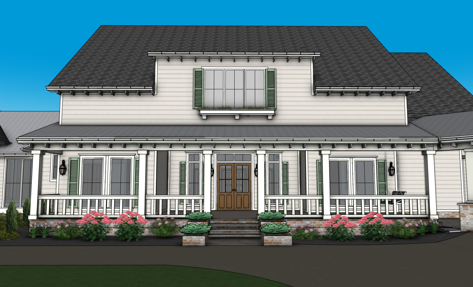 render a beautiful modern farmhouse with a white exterior dark grey shingle roof with some metal accents and large windows some with pine green shutters surround the house with lush green grass and a well maintained garden with vibrant pink flowers and healthy green shrubs set against a clear blue sky evoke a peaceful welcoming atmosphere with soft midday lighting enhancing the house s charm