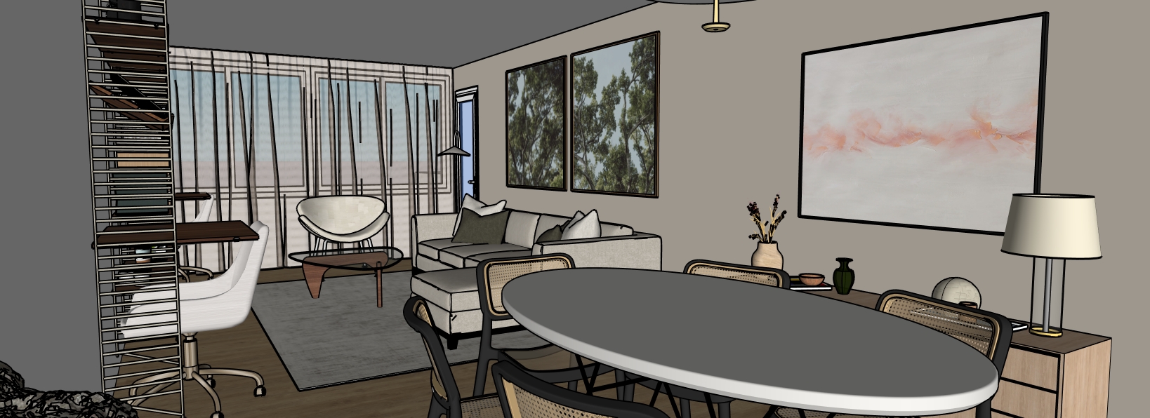 modern living room cozy and elegant atmosphere the walls behind the sofa is painted in soft taupe the rest of the wall in off white color use warm lighting to create a welcoming ambiance the bookshelf is sleek with dark walnut shelves and black metal framing holding decorative items the sofa is a light gray color with plush cushions in earthy tones olive green and beige the armchair is a mid century modern design in white fabric the round dining table is dark charcoal gray curtains are sheer gently filtering light add abstract paintings with subtle hues of orange and gray include a floor lamp with a minimalist black base overall maintain a balance of modern sophistication and warmth the rug behind the sofa in light gray and beige tones