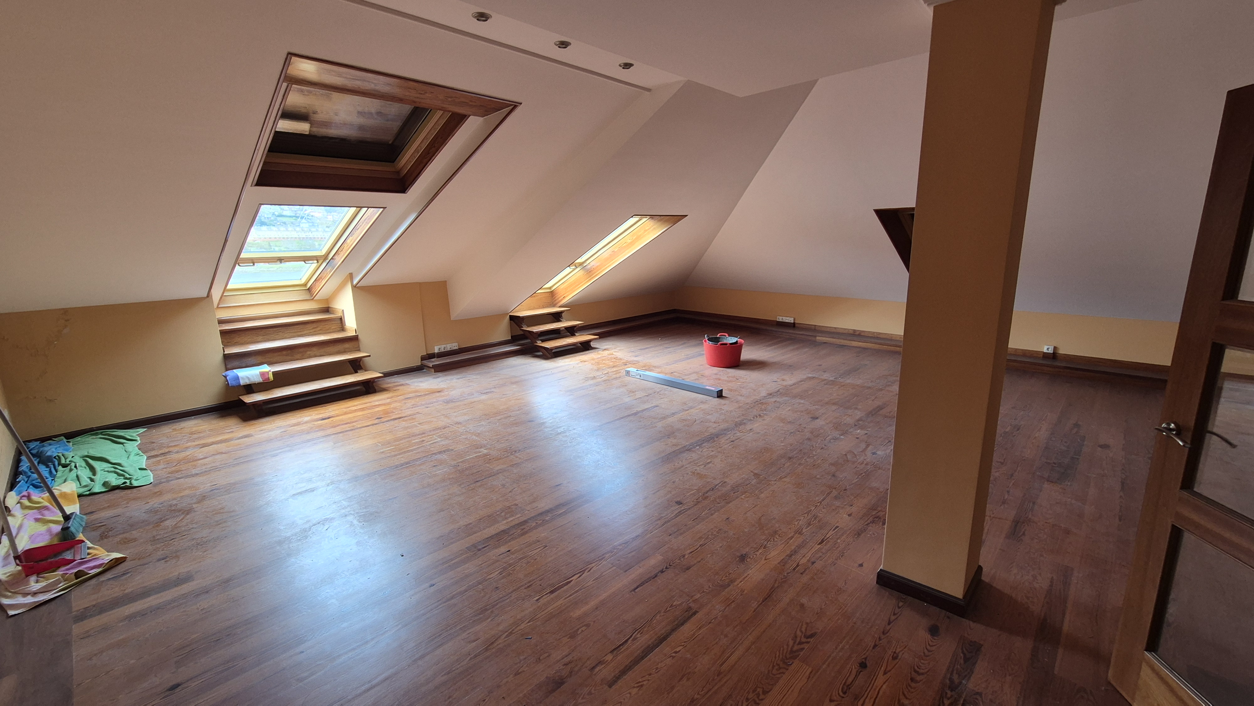situa armarios bajos en la pared bajo el tejado no pongas television y solo un sofa tipo esquina y una mesa redonda todo estilo moderno