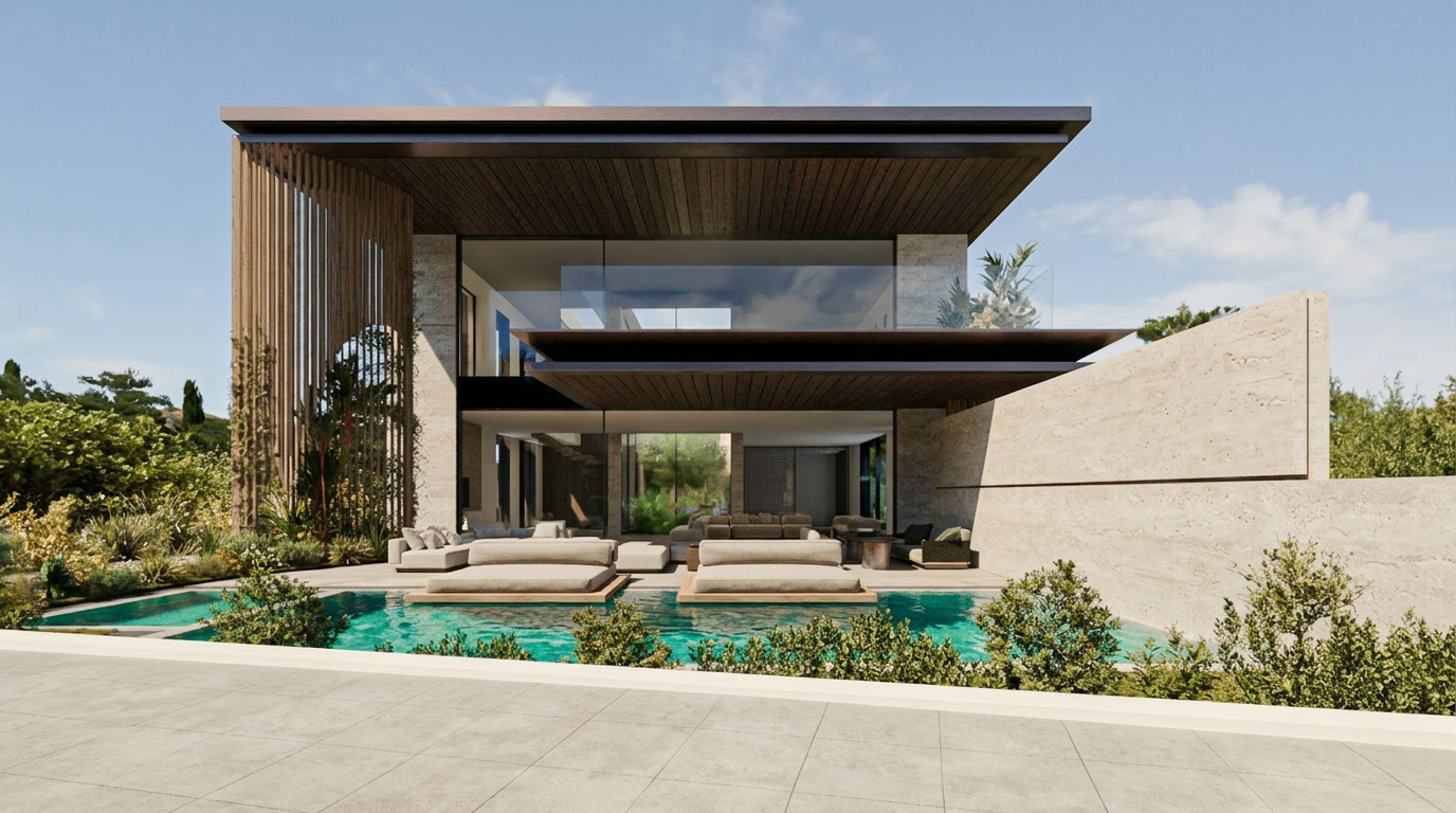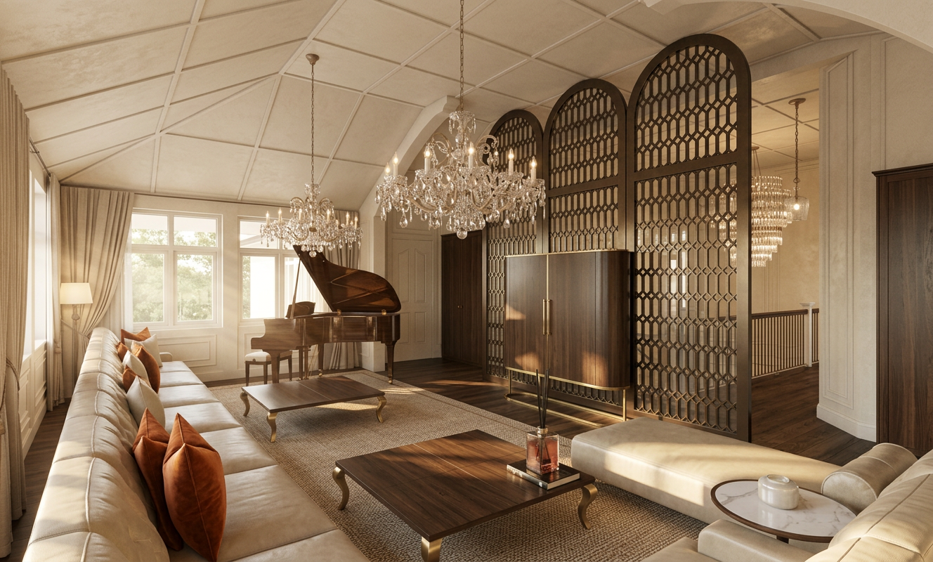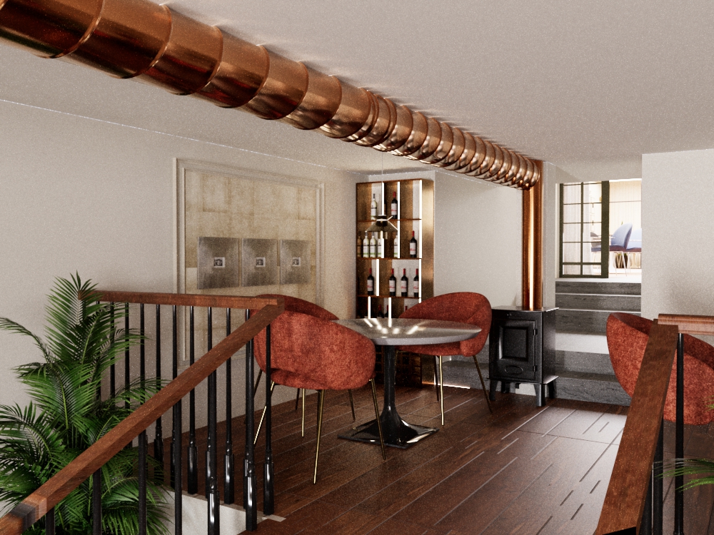 use the provided image as a fixed base maintain color mode preserve exactly the same geometry architecture camera position perspective proportions ceiling copper pipe stairs railings floor and furniture placement do not modify architecture layout or spatial configuration enhance the scene to create an ultra photorealistic luxury restaurant atmosphere all materials must appear high end refined and extremely realistic chairs must be upholstered in deep burnt terracotta velvet hyper realistic rich tactile fabric with visible velvet grain subtle sheen soft folds and natural light absorption not plastic or glossy the stair handrail must enhance the black metal vertical bars with a deeper refined matte black finish elegant metal texture and subtle realistic reflections the wine cellar structure must be in burnished dark metal brunito finish elegant and refined add integrated warm led lighting 2700k inside the wine display to create an intimate and dramatic wow effect enhancing bottle silhouettes and glass reflections without overexposure wall artworks must have soft integrated backlighting creating a refined halo glow around the frames the table must be styled with a minimal chic luxury table setting elegant porcelain plates crystal glasses refined metallic cutlery linen napkins and subtle candles perfectly scaled and naturally arranged lighting must be warm cinematic and intimate with realistic shadows soft contrast and strong depth ultra photorealistic intimate elegant contemporary fine dining mood