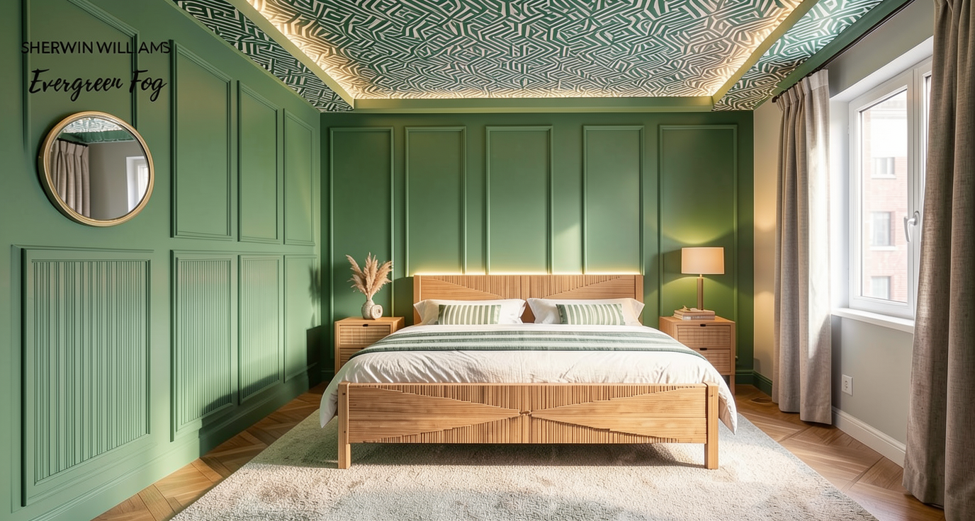 victorian interior shot create a cozy vintage inspired kitchen interior with a warm and welcoming atmosphere the cabinetry is painted in a soothing slate blue with elegant brass handles for a classic touch the countertops showcase a polished natural white marble with subtle gray veining the walls are adorned with a rich floral patterned wallpaper in deep olive green and soft rose colors complementing the rustic dark wood floorboards that add warmth the ceiling is painted in a muted charcoal color with soft recessed lighting enhancing the cozy ambiance a white sleek refrigerator stands out against the muted backdrop while a hanging light fixture with soft golden yellow lamps casts a gentle glow over the central island the kitchen exudes an inviting classic charm perfect for leisurely cooking and family gatherings architecture