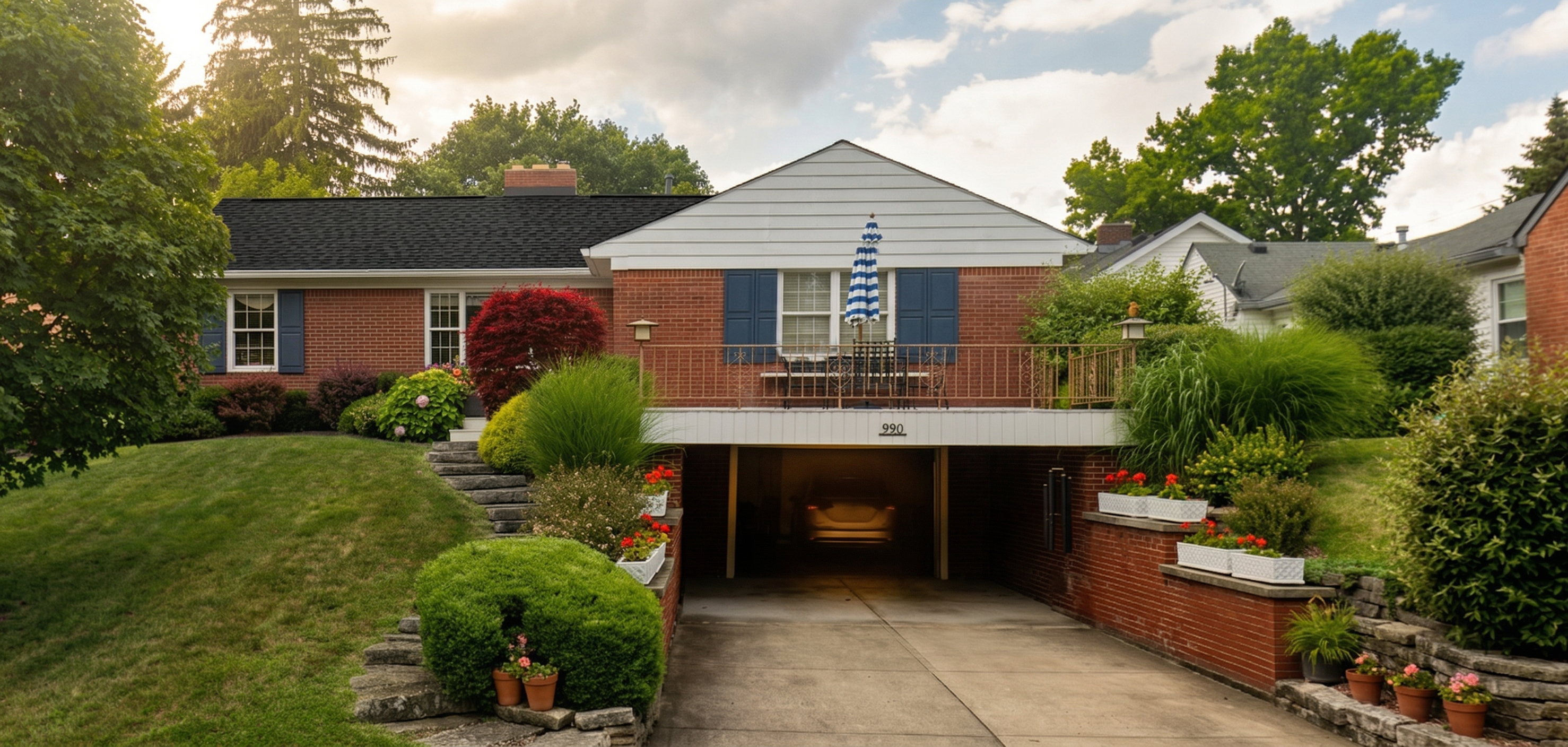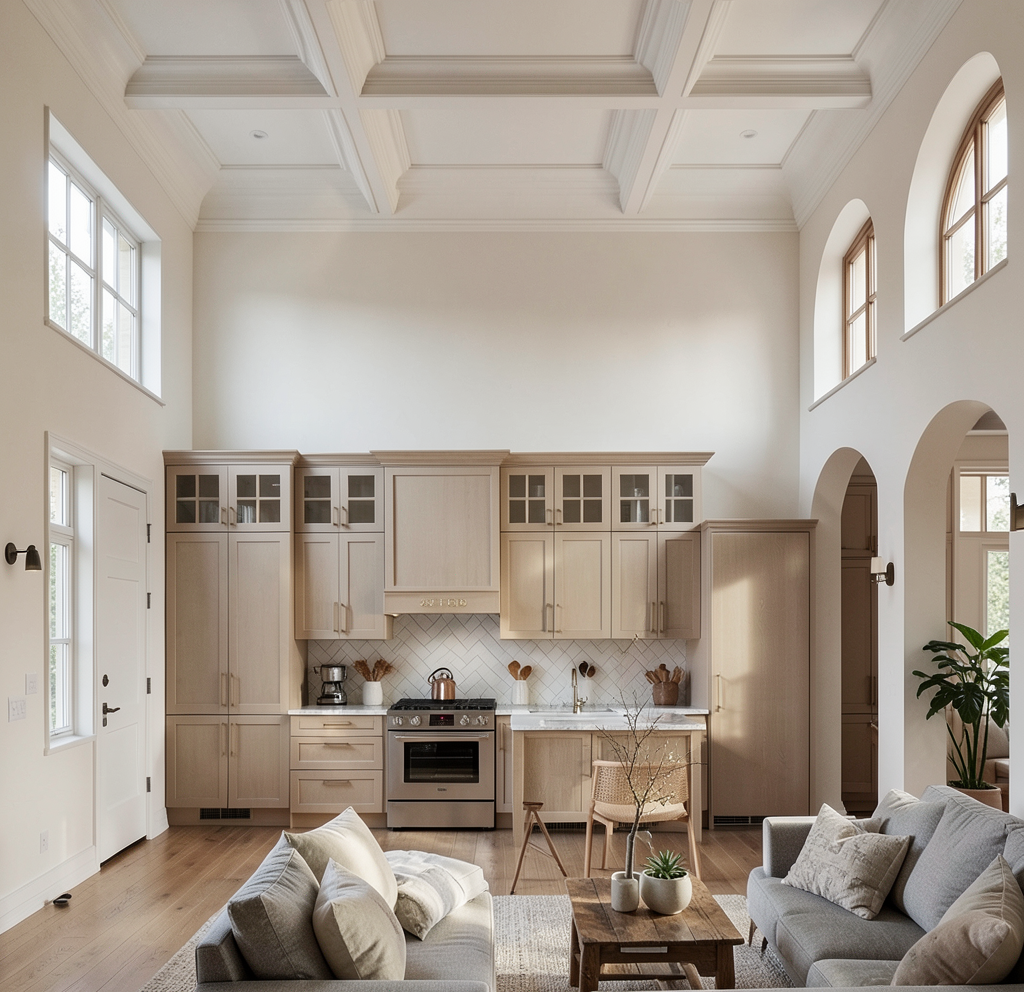 generate a high quality photorealistic render of the provided architectural elevation drawing preserve exact geometry proportions window spacing and material layout render at 4k resolution with ultra realistic daylight lighting clear sky soft shadows ambient reflections ensure all exterior materials colors and textures match the client s specifications exactly match the window grid style do not add extra dormers or light fixtures charcoal roof to the image use only the materials specified in the elevation drawing and color list match each component as follows body color cream trim color white windows black front door tricorn black wood stained garage doors lighting should highlight color accuracy and realistic reflectivity use global illumination and hdri sunlight calibrated for afternoon warm tone maintain true color fidelity consistent exposure and physically accurate shadows add context elements landscaping realistic lawn shrubs and shadow cast trees suited to suburban setting create concrete driveway straight out from garage door with walkway from front porch to driveway background complementary skies matching exposure no distortion or overenhancement output a single landscape oriented photorealistic rendering that is architecturally faithful visually balanced and color accurate to the above specifications tall prairie grass foreground fog trees in background sunlight