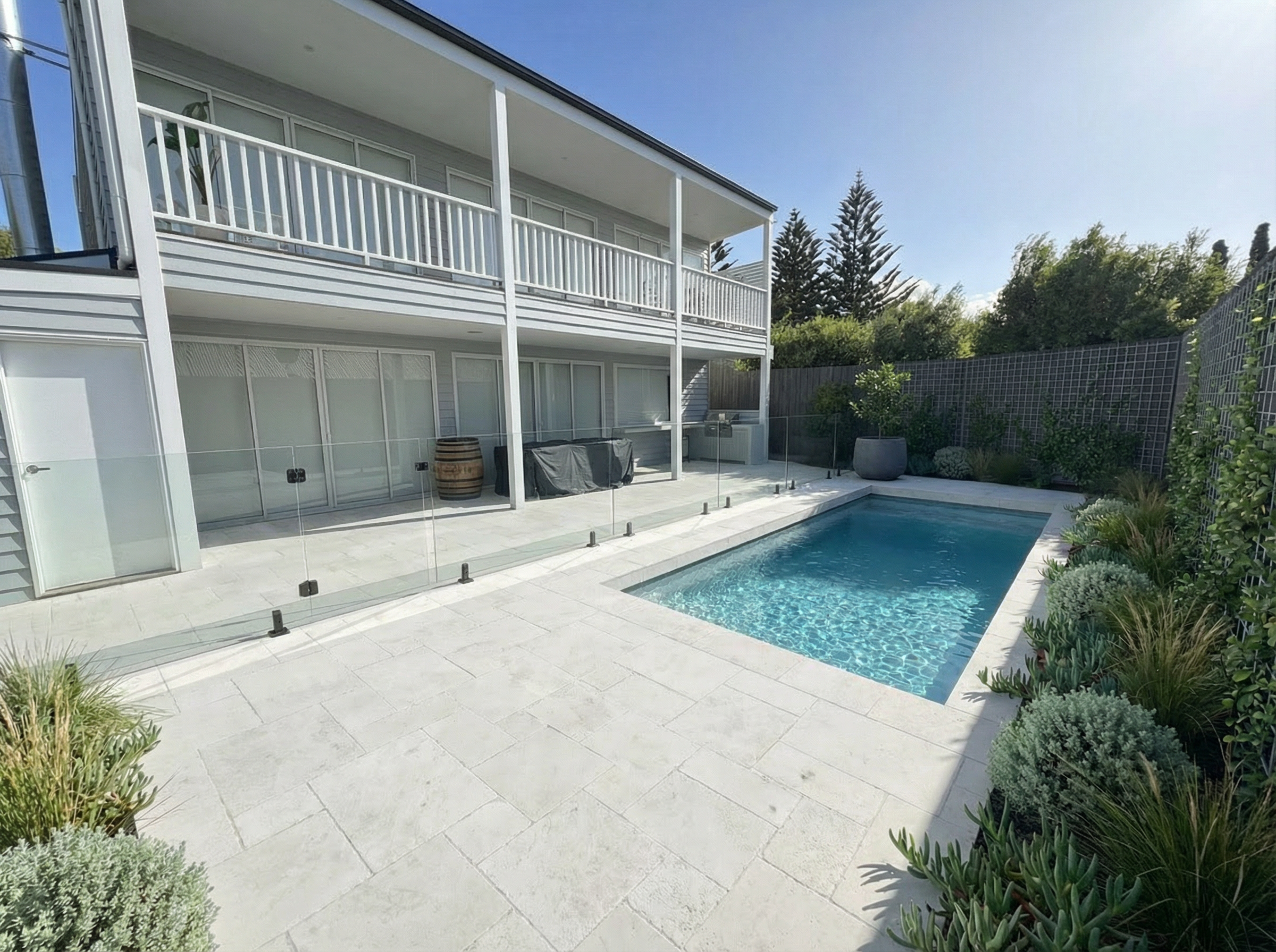 render a luxurious modern house exterior with a tranquil atmosphere the two story building features a sleek design with soft grey and white tones enhance the clear glass fencing reflecting sunlight the swimming pool should be a vibrant inviting turquoise with gentle ripples surround the pool with lush greenery featuring various shades of green for a fresh natural look the sky is a bright clear blue casting warm sunlight across the scene creating a sense of calm and relaxation can you add an olive tree in a pot in the pool area and make the paving a sany grey limestone