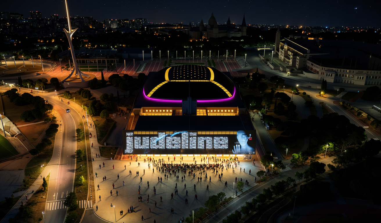 make the image at night pero viendo los edificios with people entering the building remove the road whith cars and make a street with people walking
