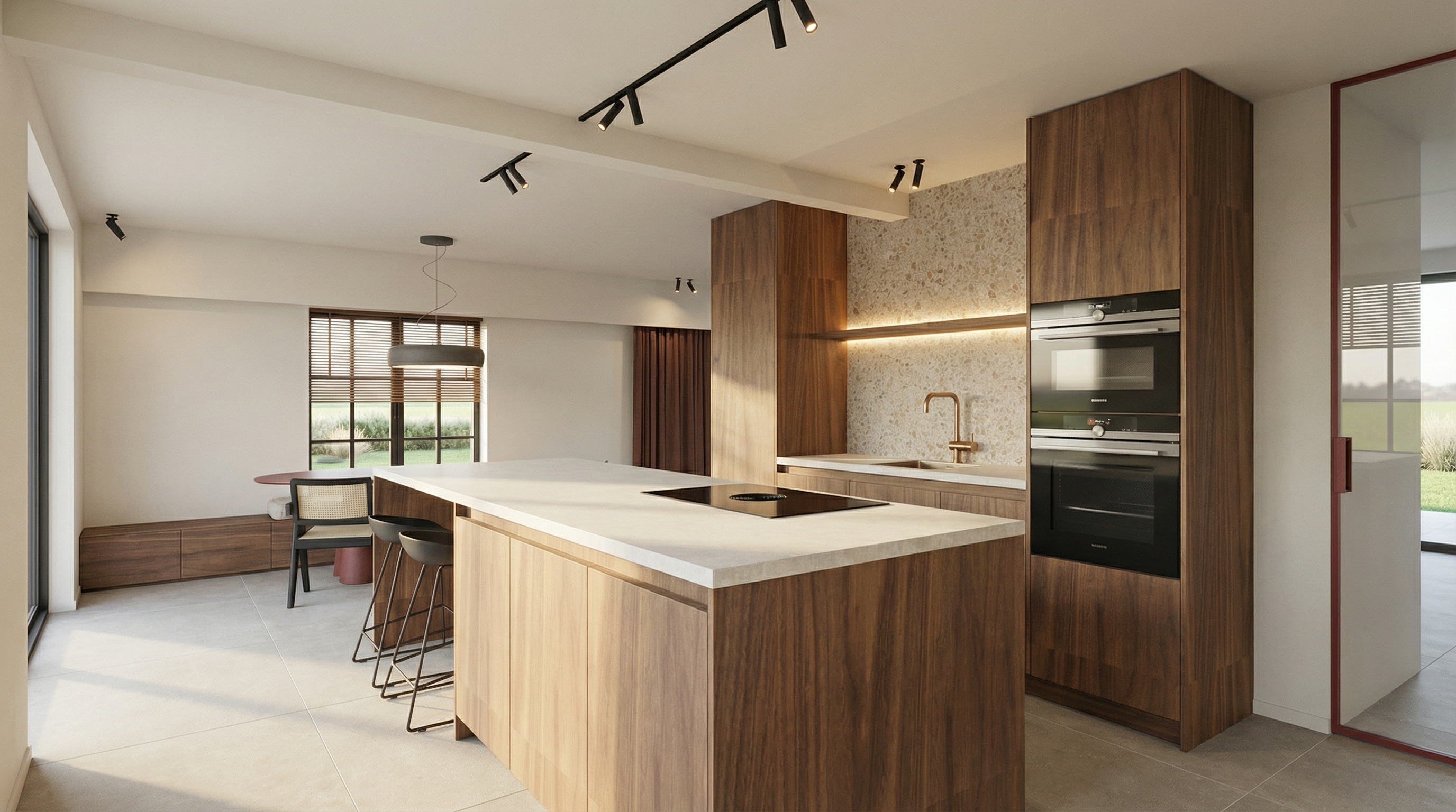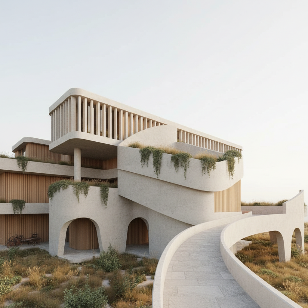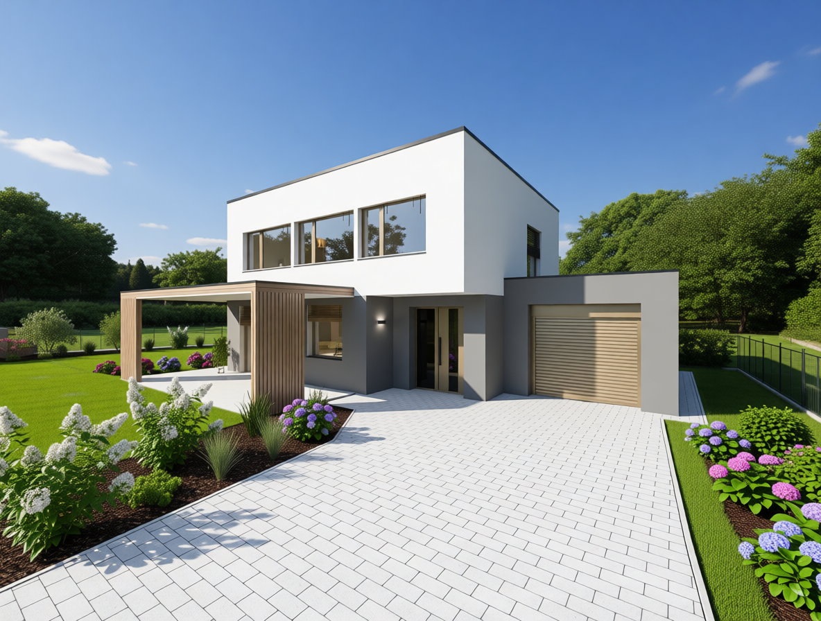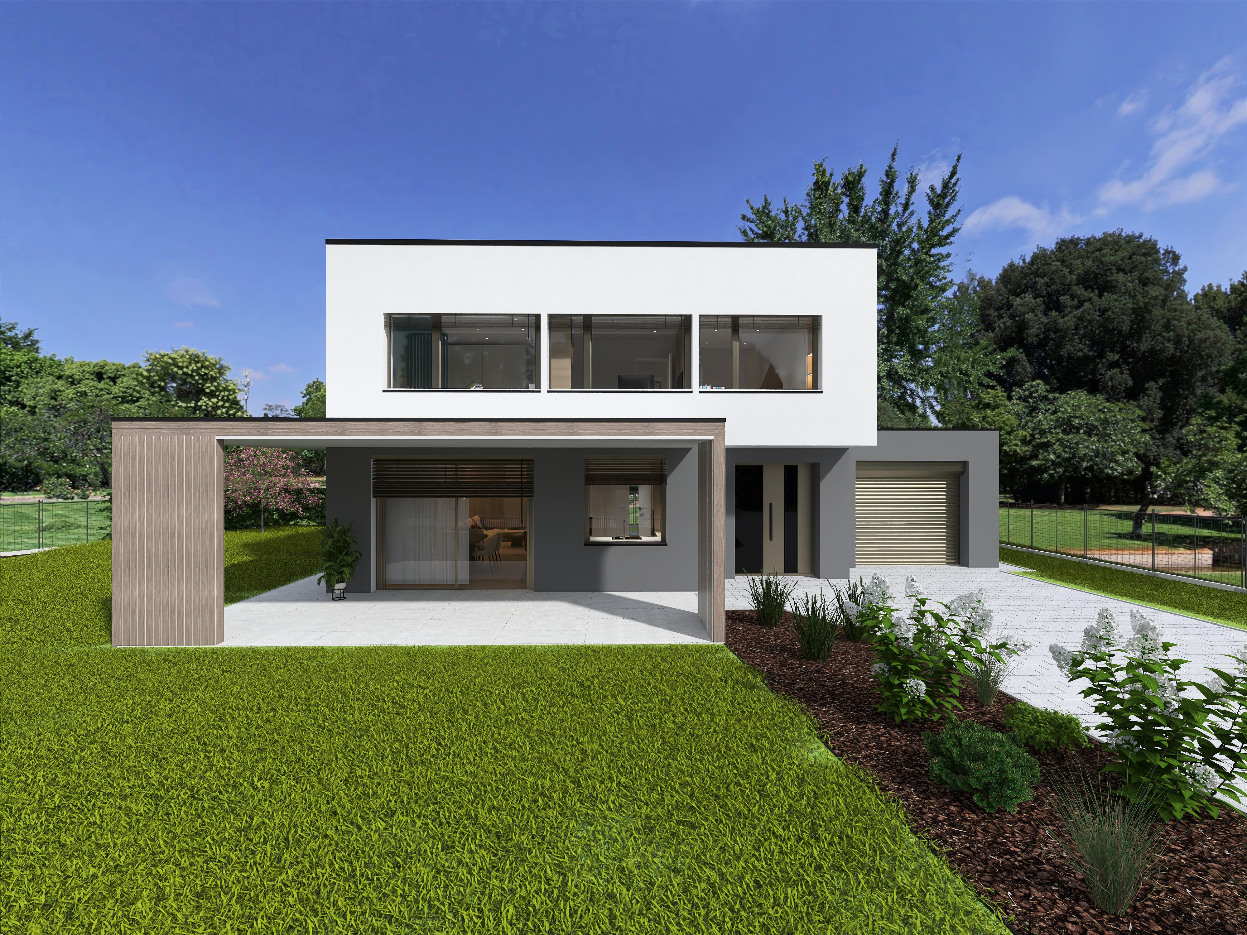 render a photorealistic 3d perspective of this house reference the current material style just enhance them light bronze decor in doors windows and garage doors wood decor on the pergola keep model geometry the same windows doors roof walls garage door pavement driveway do not change the view only enhance the current materials and make the landscape nicer vegetation