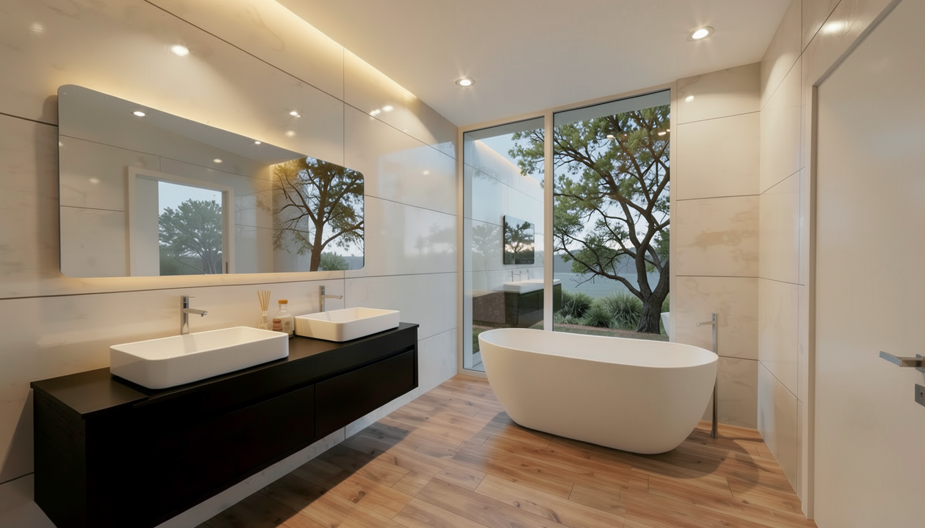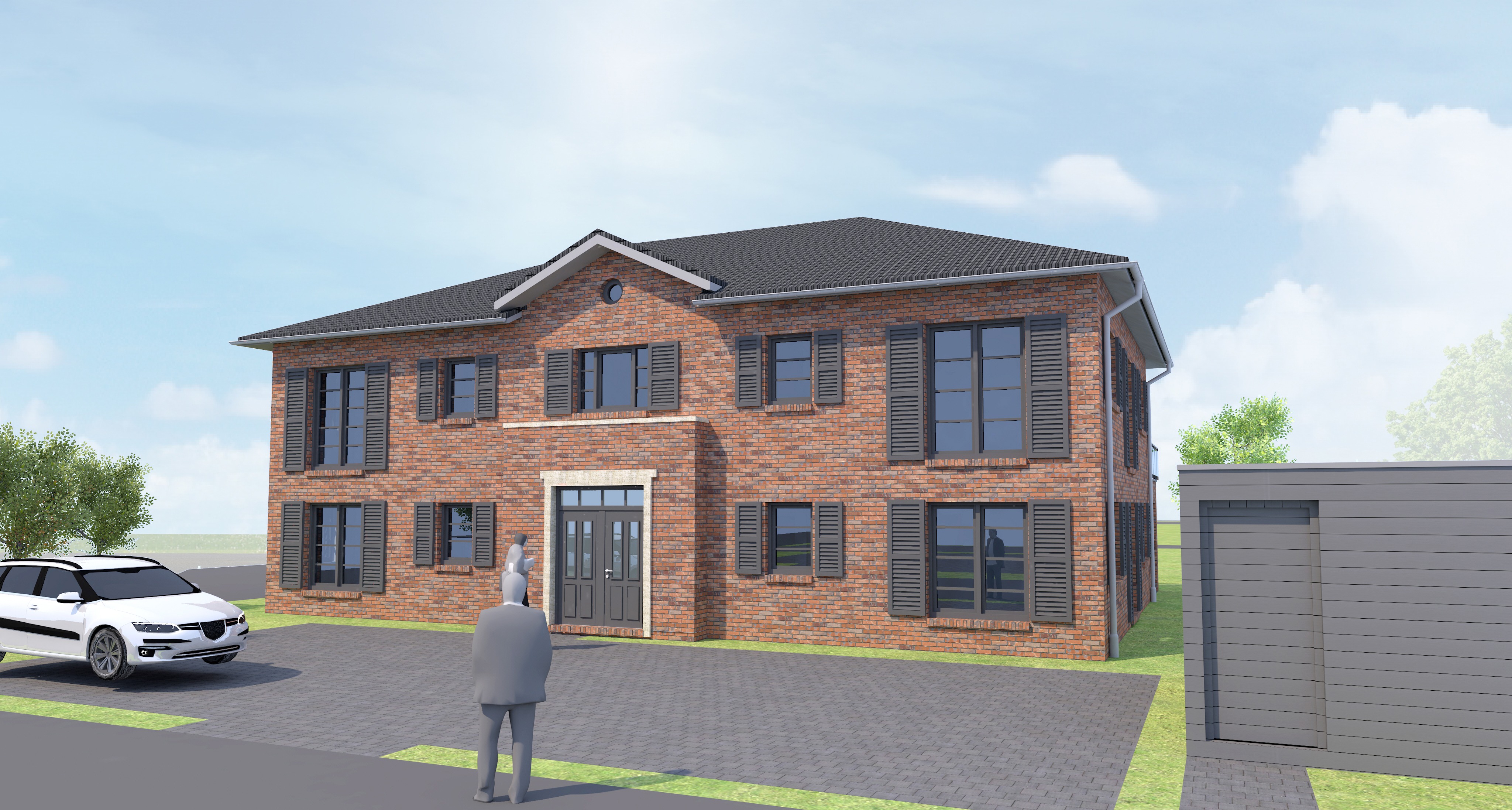 transform this rendering into an ultra photorealistic architectural photograph shot in summer bright atmospherical lightpreserve exact geometry and composition from the original image enhance only real world material behavior natural reflections roughness variation subtle imperfections apply physically accurate daylight soft shadows realistic global illumination professional architectural photography look 35 50 mm lens straight verticals natural exposure no cgi look indistinguishable from a real photo erg nze hintergrund wohnsiedlung und hecken und b ume stelle as auto auf den boden nicht schwebend erg nze niedrige hecken im vorgarten erestelle einen vorschlag zu der u eren fassadenarchitektur