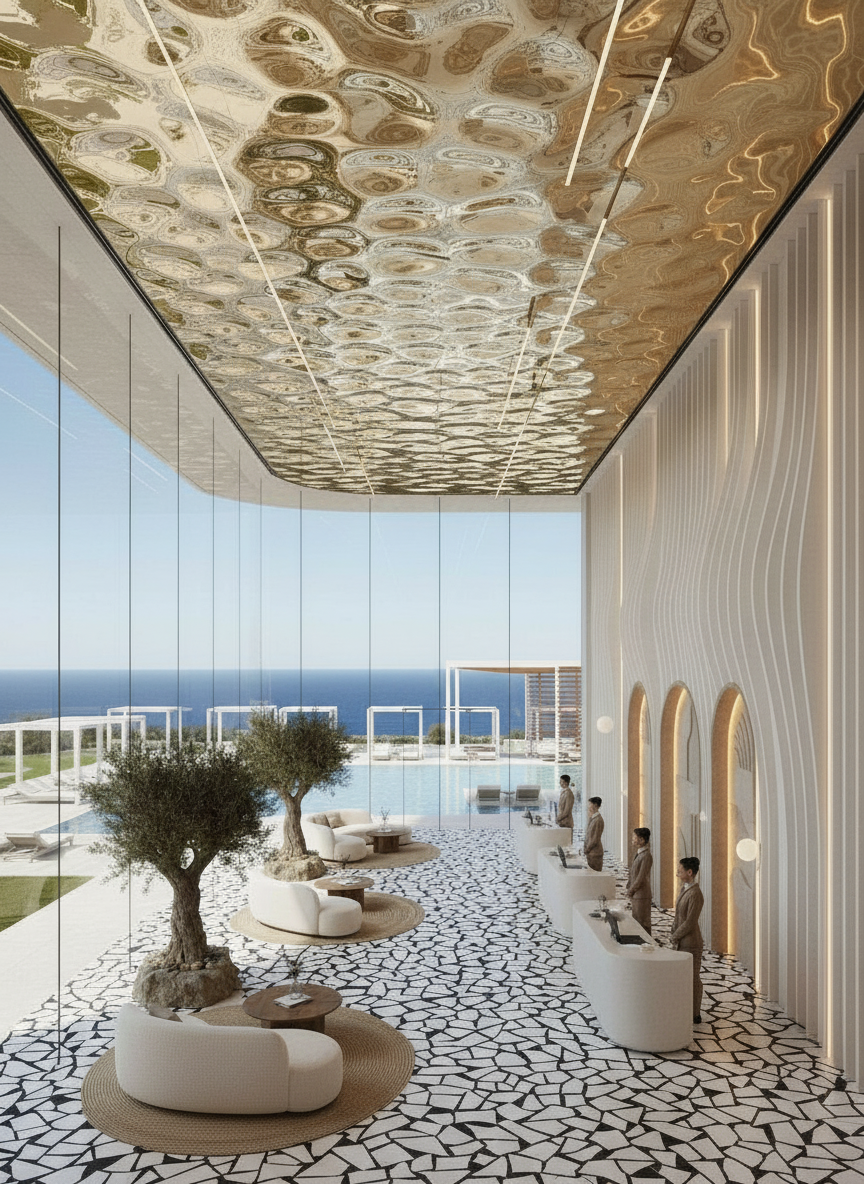 keepthe landscape appears to the left and depth is not like that always based on the proportions of the image that i loaded to accept the conversion is a 3d empty model with the left curved glass showing the wrong landscape which is initially located at a depth of one and a half floors below that is this lobby is at a height in relation to the tire with the landscape higher by one and a half floors there is a large swimming pool and we can also see it from above in the far right always outside the window we see from above a pergola roof with a white frame a louver shaped outline in the outline and with wooden beams between them in the background on the left a descent continues with the rest of the hotel complex where modern beige elements of single story rooms with swimming pools in front and a landscape studied and organized even further to the left in the background the perspective of the sea and the beach is visible this is how i want what we see outside the window to be formed i emphasize that i want the height of the lobby to be lower i want it close to the same proportions that immage shows with the model exactly the proportions and forms of the basic architectural environment that you have in the photo that is to be converted into an interior concept and finishes texturing design this photo is the basic three dimensional from the actual sketchup program of the actual study cleverly use the personality and most basic elements from the reference images and create an interesting and original composition