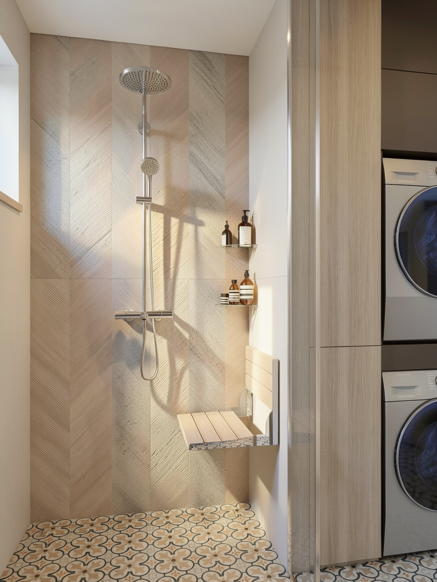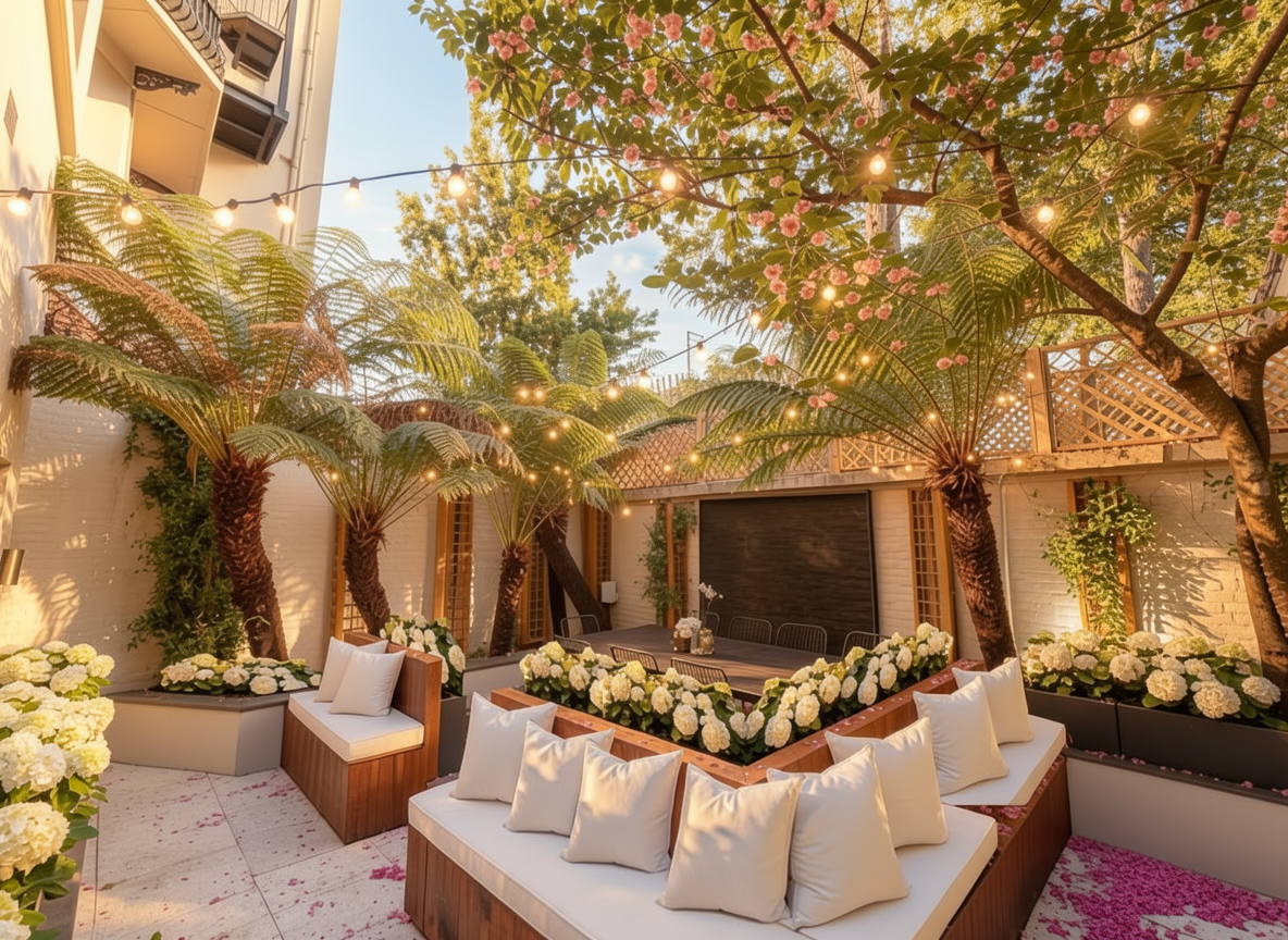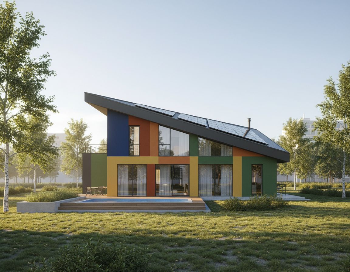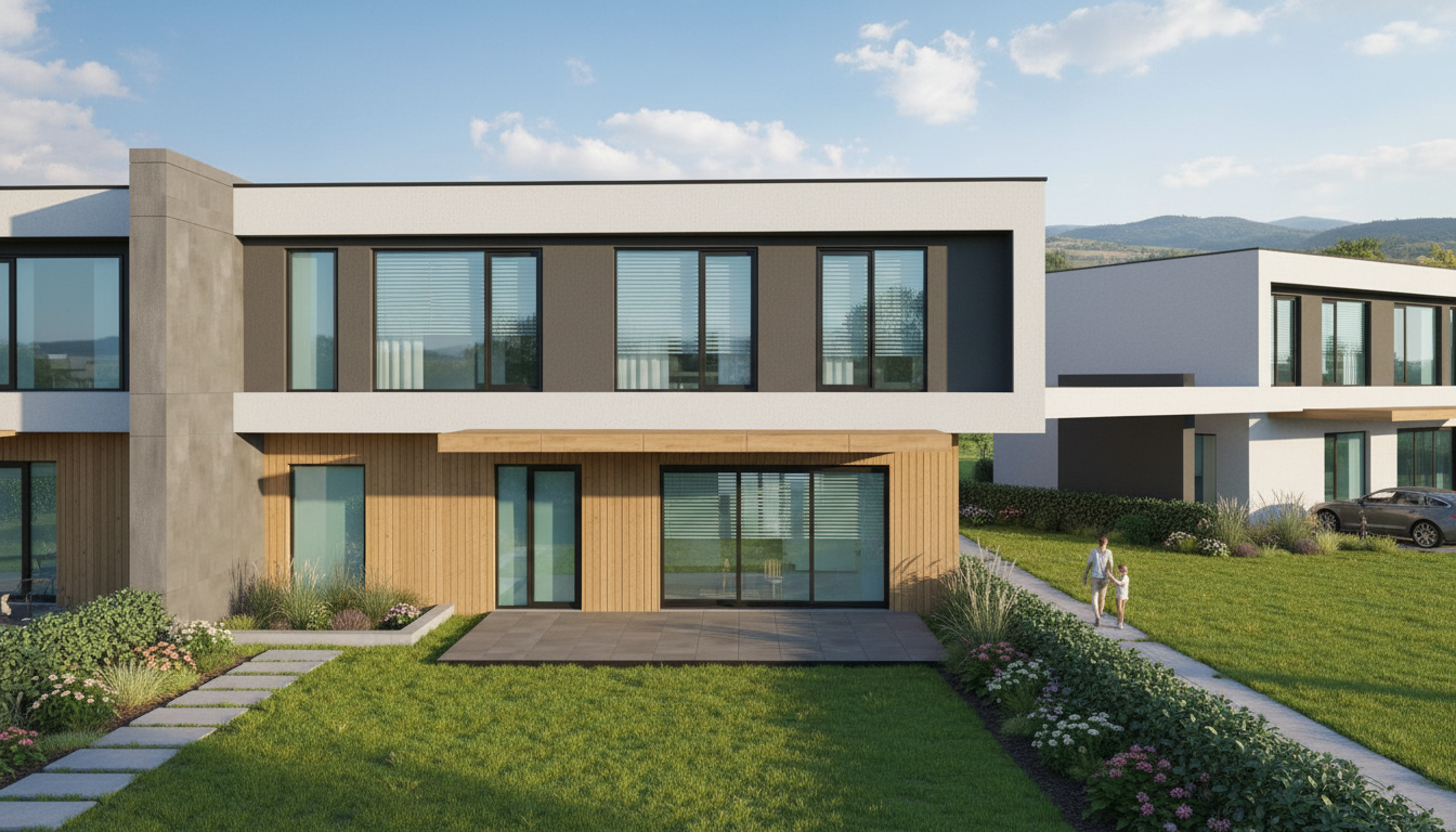 exterior shot daylight environment make white material white facade stucco make grey material dark grey stucco make the grey vertical element from grey tiles add curtains and some interior inside put exterior furnishing and some people