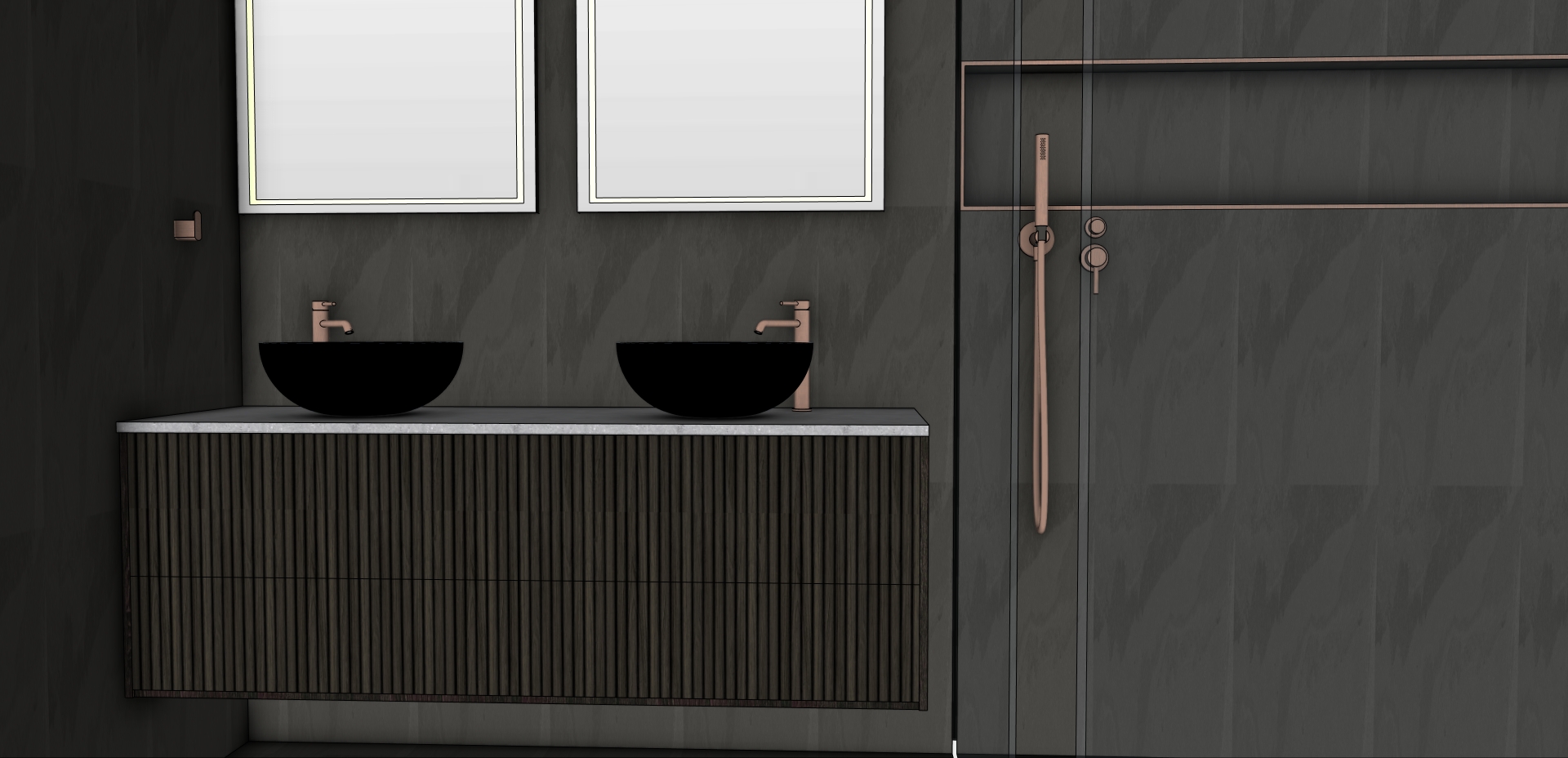 remove the reflection of garden from the mirror in ai image make the tiles and vanity darker to closer reflect the original render