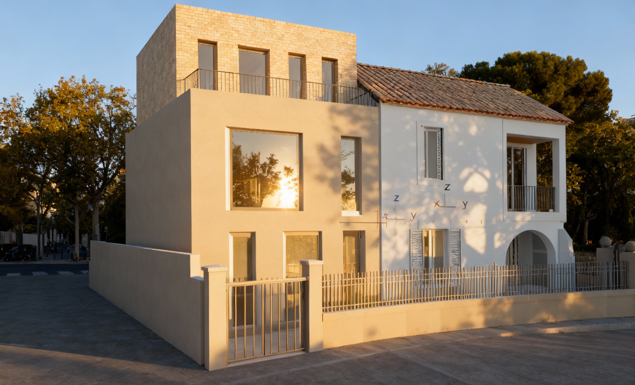 lot of reflects and sun light the sun illuminates the facade that we see some trees and a street of marseille in the backgroung facade more in the light more reflect all is painted no stone the fence call is beige like the extension more shadows of trees on the facade my point of view the fence and the building on the left are same color the attic is in little beige bricks more realistic view the house on the right is clearer