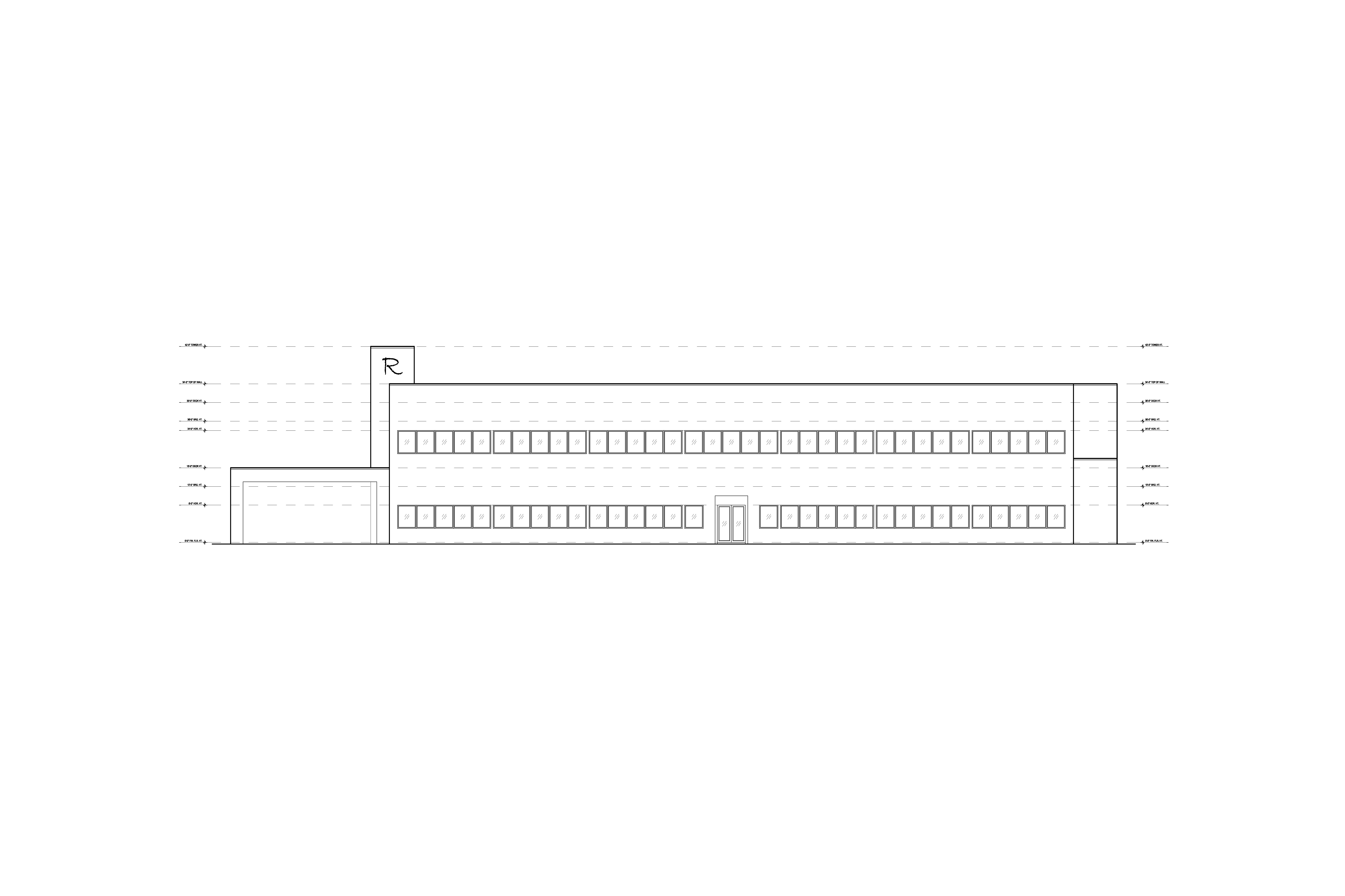 modern two story office building base color should be smooth white finish black trim and windows dark grey accent tower with black r logo smooth finish parking lot is to the right and behind the building this is the steet view image