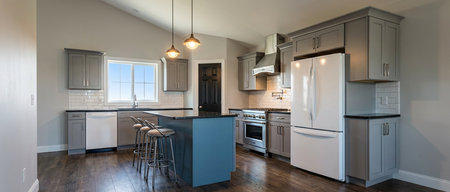 change the countertops to light coloured marble change the cabinet pulls to brass change island to wood grain change the appliances to brushed stainless change kitchen faucet to brass