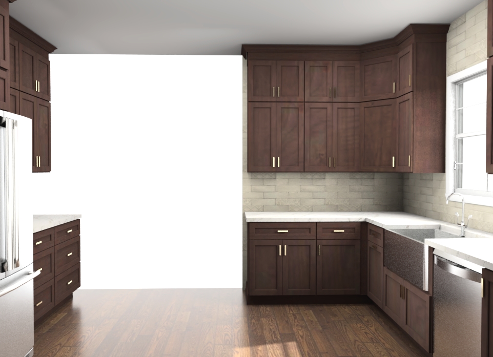 create a realistic image from this kitchen rendering do not alter the layout in any way cabinets are a mocha stain on maple with taj mahal countertops and a creamy beige subway tile add soft interiror lighting