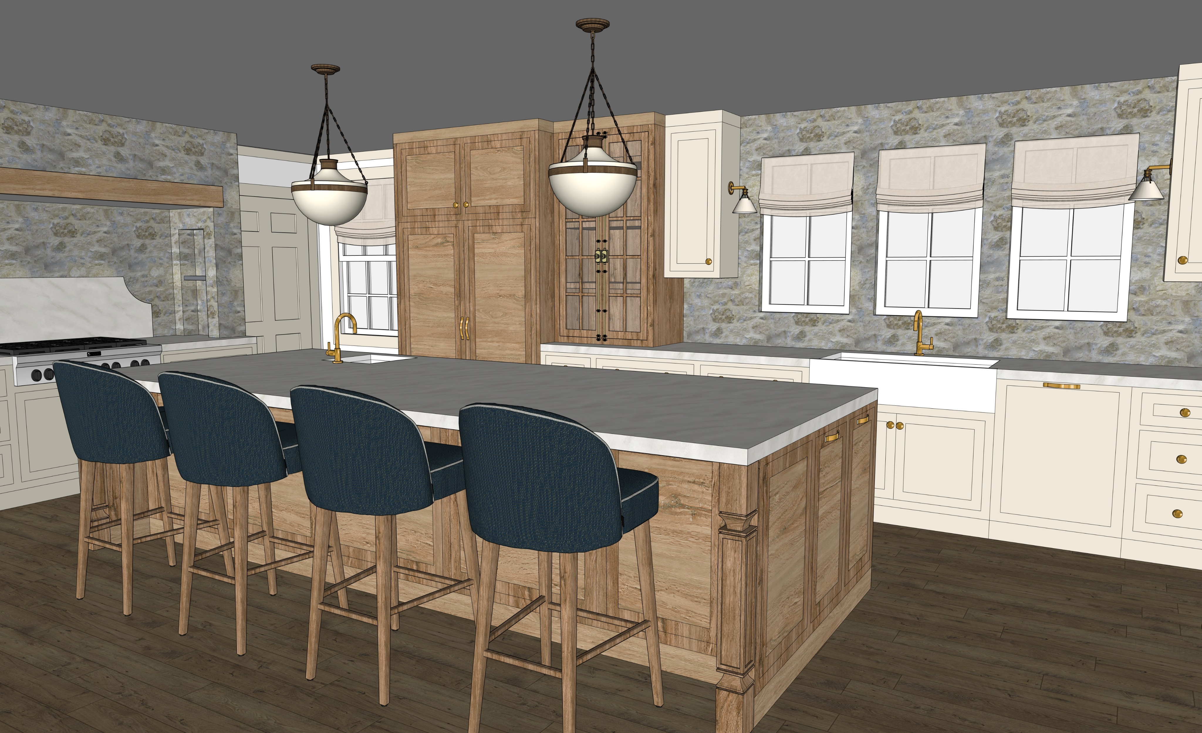 photorealistic traditional kitchen rendering prompt create a highly photorealistic interior rendering of a traditional european inspired kitchen using the provided reference image as a fixed architectural model the layout cabinetry proportions island size and placement window and door locations stone walls beams columns and camera perspective must remain exactly as shown do not redesign reposition or reinterpret any architectural elements the space should feel warm serene layered and highly refined similar to a professionally photographed luxury custom kitchen with strong material character and a lived in collected quality architecture to preserve exactly large central island with integrated sink perimeter cabinetry layout and spacing range wall with stone surround and backsplash wood door to the left of the range do not convert to a window window placement and spacing along the sink wall stone walls wrapping the kitchen wood beams and structural columns keep exact placement tall cabinetry and glass front cabinet location pendant lighting locations above island all cabinet alignments proportions and spacing do not add or remove any elements do not shift openings cabinetry or structure materials and realism enhance realism with physically accurate high end materials stone walls critical aged limestone appearance with variation in cream tan and muted gray beige tones irregular stone sizes and edges visible mortar joints with depth and shadowing matte chalky timeworn finish avoid uniformity avoid cool tones avoid smooth or modern appearance wood elements island cabinetry beams and columns should feel natural warm and slightly aged visible grain variation knots and tonal shifts subtle imperfections and patina matte to low sheen finish only no gloss beams hand hewn reclaimed oak look irregular edges tool marks checking and age warm tone not gray or washed out columns warmer and richer in tone than raw wood more character and depth in grain cabinetry painted cabinetry in soft warm cream not stark white no gray or green cast matte finish with subtle panel shadowing wood cabinetry should feel furniture like and bespoke not flat or uniform countertops maintain model color direction honed natural stone appearance soft matte finish with minimal reflectivity refined ogee edge profile hardware aged brass or antique brass with warm patina soft sheen not polished barstools wood bases with natural variation upholstered seats in rich deep blue and green tapestry style fabric with texture and depth high end tailored appearance not flat or synthetic lighting use layered realistic architectural lighting soft natural daylight entering through windows show soft greenery outside windows warm ambient fill light to gently lift shadows subtle under cabinet lighting only where appropriate very soft glow inside glass front cabinets no lighting behind the range backsplash no under island lighting no harsh spotlights lighting temperature 3200 3800k warm neutral camera settings eye level perspective 5 ft height 28 35mm architectural interior lens maintain original camera angle from reference high dynamic range ultra high resolution 4k 8k styling minimal controlled add subtle realism only a ceramic vessel or bowl a wood cutting board a small arrangement of greenery possibly a folded linen no clutter no decorative excess no rugs rendering style professional architectural interior photography balanced warm slightly moody lighting with strong material depth soft shadows gentle highlights and realistic contrast materials should feel tactile and dimensional avoid glossy finishes avoid flat surfaces avoid overly bright or overly dark results geometry guardrail critical treat the reference image as a fixed 3d model do not change cabinet layout do not move or alter island do not change window or door locations do not add beams or remove beams do not alter stone placement do not introduce new lighting locations enhance materials lighting and realism only
