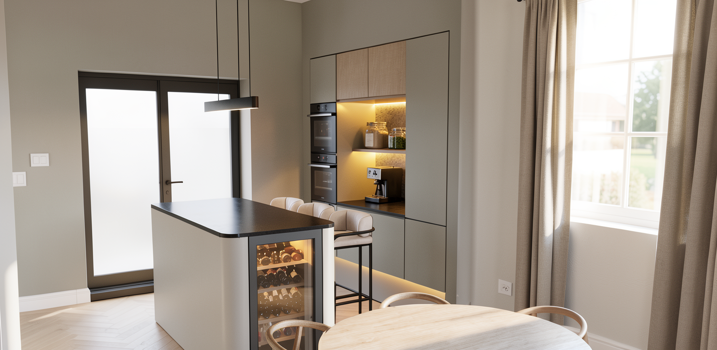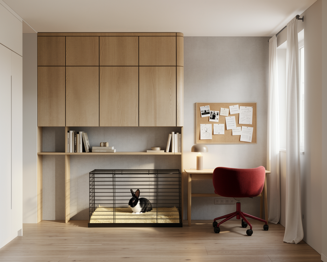 use the provided render strictly as the base image do not change the camera angle composition lighting furniture placement materials architecture or any other elements in the scene modify only the rabbit and the hay inside the cage under the cabinet change the rabbit s fur color to predominantly black with a distinct white neck chest area keep the same pose and position but make the rabbit smaller so it looks more natural and proportionally realistic inside the cage reduce the amount of hay in the cage so that only a small minimal layer of hay remains on the bottom the rabbit must clearly appear behind the metal cage bars the cage bars must remain fully visible in front of the rabbit so it is obvious that the rabbit is inside the cage and not in front of it do not modify anything else in the image