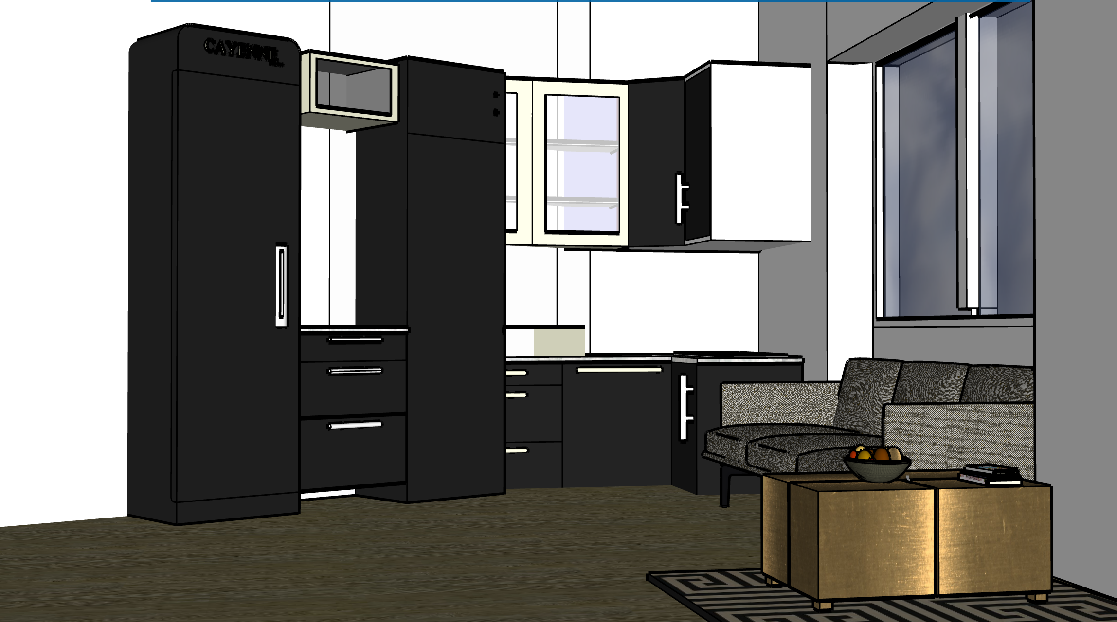 contemporary interior shot luxurious wooden floor dark modern kitchen golden coffee table architecture
