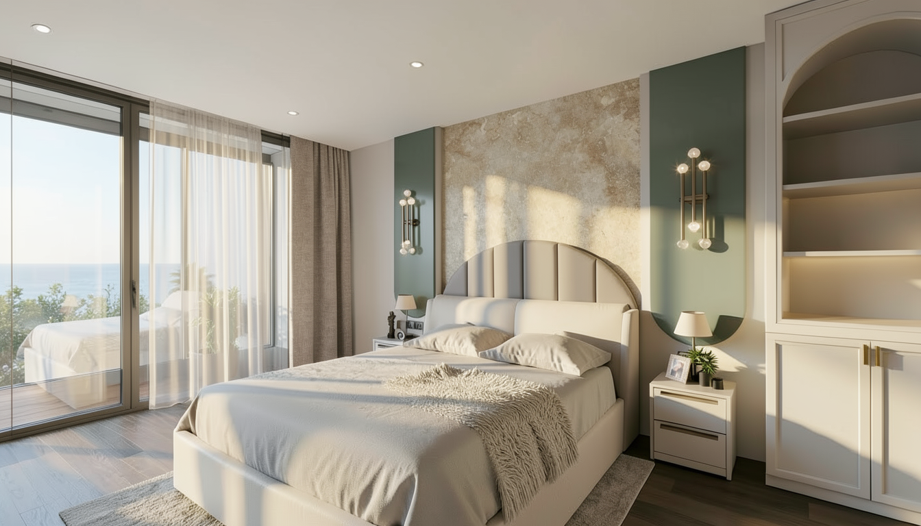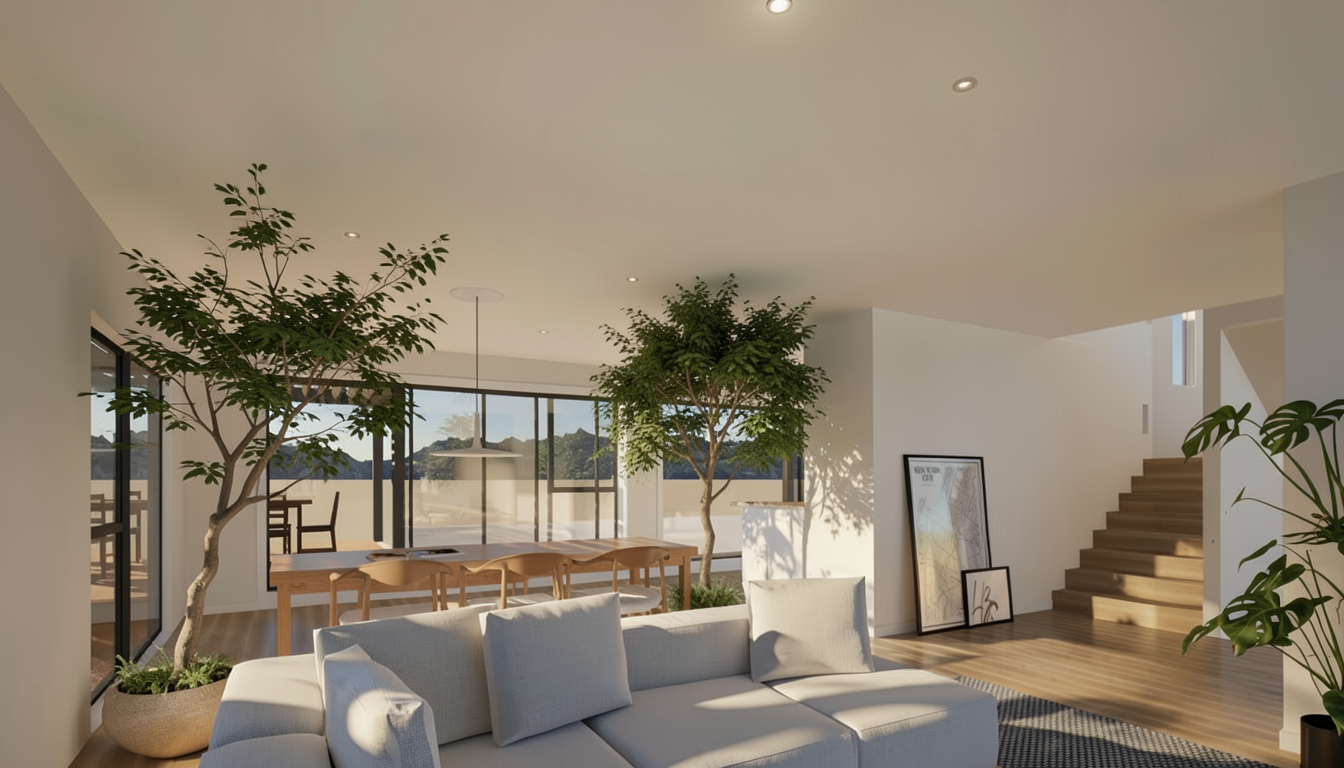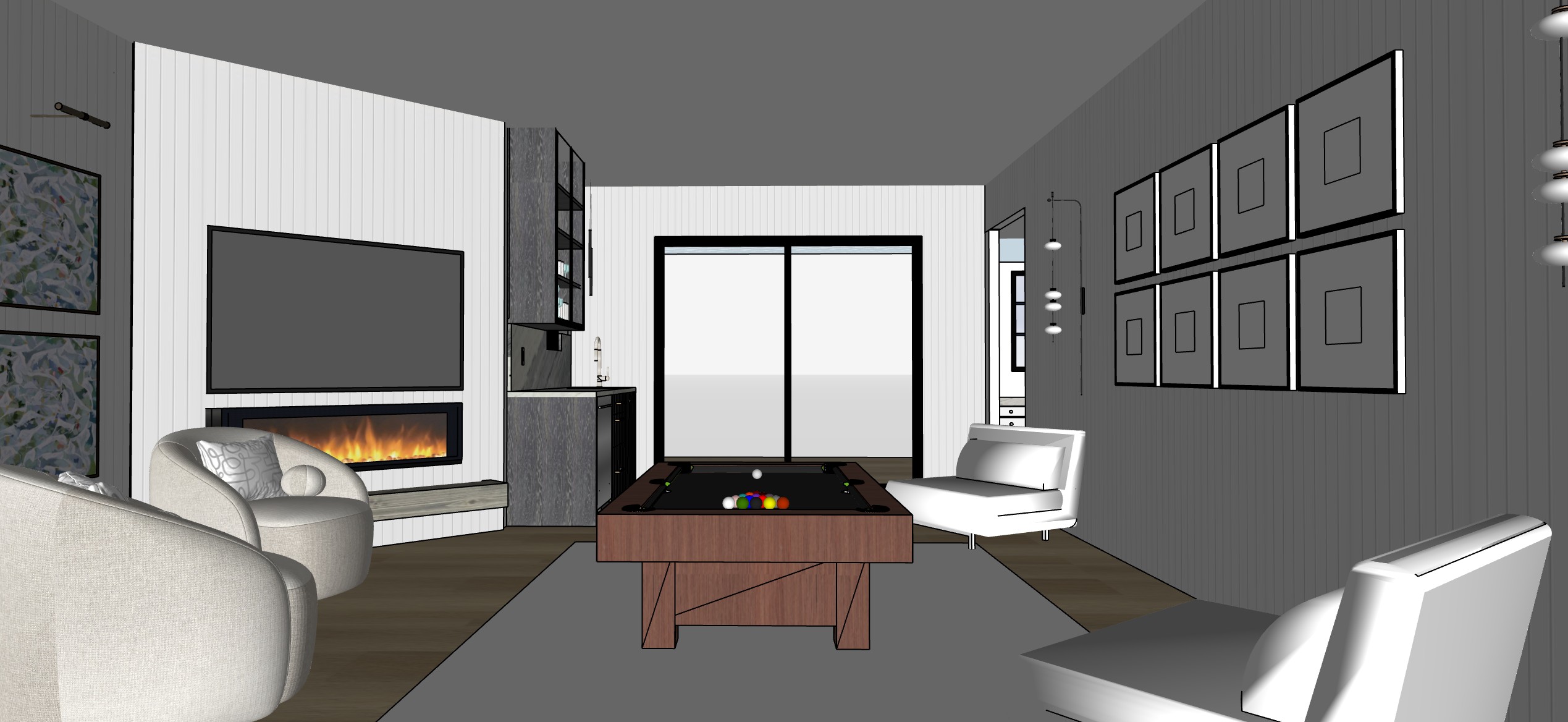 create a photorealistic rendering of this downstairs living area add landscaping and pool in backyard through the sliders add landscaping in windows on left add 4 recessed ceiling lights