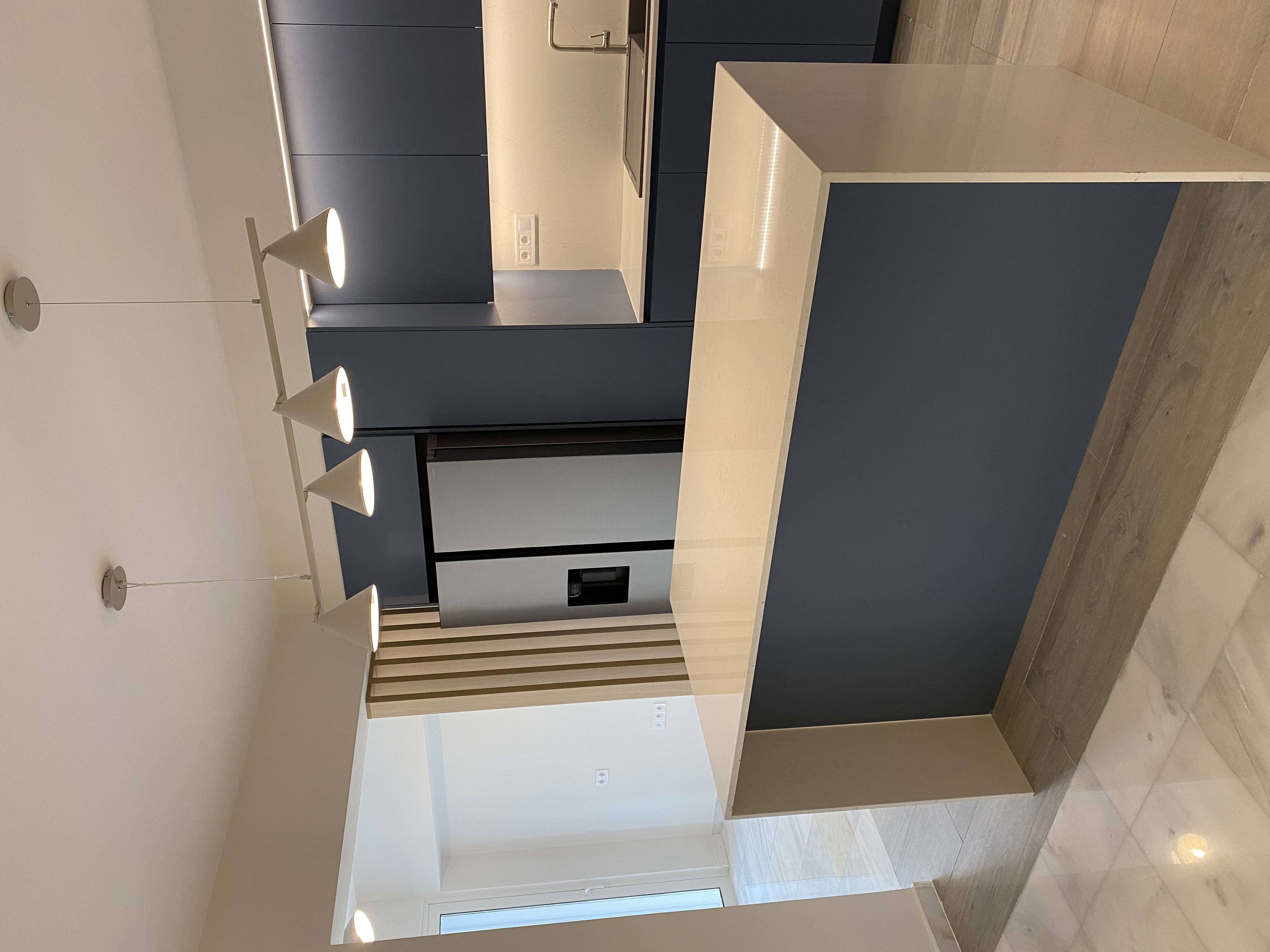 enhance this image to look like a natural real world photograph taken with a professional camera not a 3d render preserve the original layout materials and lighting exactly as they are reduce the overly clean perfect and cgi appearance by introducing subtle natural imperfections slight texture variation realistic shadow falloff and gentle surface irregularities soften edges slightly to avoid unnaturally sharp computer generated lines maintain the existing lighting exactly do not change or reinterpret any light sources especially the pendant lights above the island keep the same warmth intensity and direction of light adjust contrast and exposure to create a natural dynamic range avoid flat or overly uniform lighting slightly reduce highlight sharpness and reflections to feel more photographic and less synthetic apply subtle grain noise typical of a real camera sensor ensure materials wood paint stone look tactile and real not overly smooth or plastic do not redesign relight or restyle anything only enhance realism and photographic quality