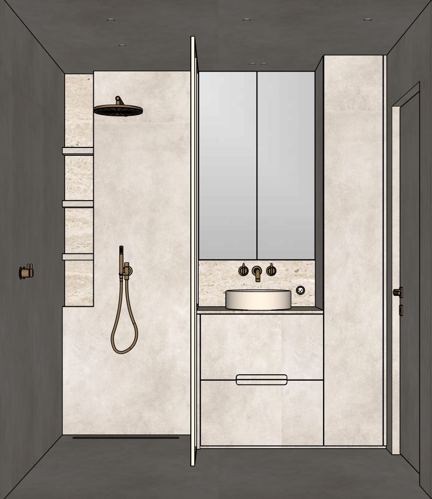 strict camera match material realism locked no redesign create an ultra high end photorealistic architectural bathroom render based strictly on the uploaded reference image the complete spatial layout architecture dimensions proportions wall thicknesses niches cabinetry mirror position shower layout glass partition ceiling height spot positions door position camera position viewing angle framing and perspective must remain 100 identical to the reference image this is a material lighting and realism upgrade only no redesign no reinterpretation no repositioning no camera change treat the reference image as a camera matched architectural backplate camera composition absolute lock camera position identical same height same distance same framing same lens feeling 24 28mm ff same horizon vanishing points and verticals no crop no zoom no pan no tilt no perspective change architecture fixed elements keep everything exactly as in the reference image walls ceiling floor shower zone niches cabinetry mirror cabinet glass wall door shelves drain spot positions and dimensions no elements added or removed shower glass fixed clear glass bronze frame no door same thickness and proportions floor walls ceiling door material lock all finished in beige mortex floors all walls shower walls ceiling door tall cabinet vanity shower shelves mortex requirements warm beige mineral tone seamless surface soft cloudy structure subtle tonal variation matte to eggshell sheen no concrete look no plaster strokes no tiling repetition must read as one continuous architectural skin stone travertino classico only these parts are travertine vanity worktop backsplash under mirror back wall of the shower niche finish satin honed visible pores natural layering soft reflections no gloss no marble veining all other shower walls remain mortex cabinetry forms tall cabinet and vanity fully in mortex integrated milled handle must remain identical same size same depth same radius subtle realistic micro rounding sanitary fittings all tapware and shower hardware in brushed bronze same models and proportions as reference includes rain shower hand shower basin tap wall mixers shower drain identical shape and placement brushed metal appearance mirror cabinet mirror is a cabinet vertical seam visible mirror plane aligned with backsplash no lighting integrated mirror reflection shows mortex wall high vertical radiator in mortex shower niche shelves in mortex back wall in travertine one single vertical led on the right side only soft concealed architectural glow no top bottom or horizontal led no led above tap no led under mirror accessories broken white towel folded on the left side of the vanity top fluffy beige rug in front of vanity width of vanity column white bath slippers on the rug natural textile gravity and softness electrical detail socket to the right of the sink only outer ring in bronze inner core in mortex beige flush integrated look lighting ceiling spots painted in same color as sink must emit visible light cones warm neutral temperature soft realistic falloff only additional lighting vertical led in shower niche no led under mirror no led above tap no other hidden leds anywhere lighting must sculpt mortex reveal travertine pores and activate bronze material realism critical all materials physically correct pbr mortex mineral softness micro tonal shifts subtle shadowing very low sheen travertine pores and inclusions soft honed highlights bronze warm color shift brushed anisotropy soft reflections ceramic sink satin lacquer same tone as mortex glass clear correct thickness edge refraction textiles fluffy rug fibres soft towel weave render quality ultra photorealistic 4k detail physically based lighting correct roughness normal maps no ai smoothing no oversharpening atmosphere warm calm spa like architectural high end minimalist bathroom material driven realism negative prompt cgi look render look sketch style cartoon style flat lighting harsh shadows wrong mortex concrete look tiled walls wrong travertine glossy stone marble plastic chrome added leds led under mirror led above tap extra lights extra furniture camera change zoom crop distortion blur noise low detail people clutter game engine look