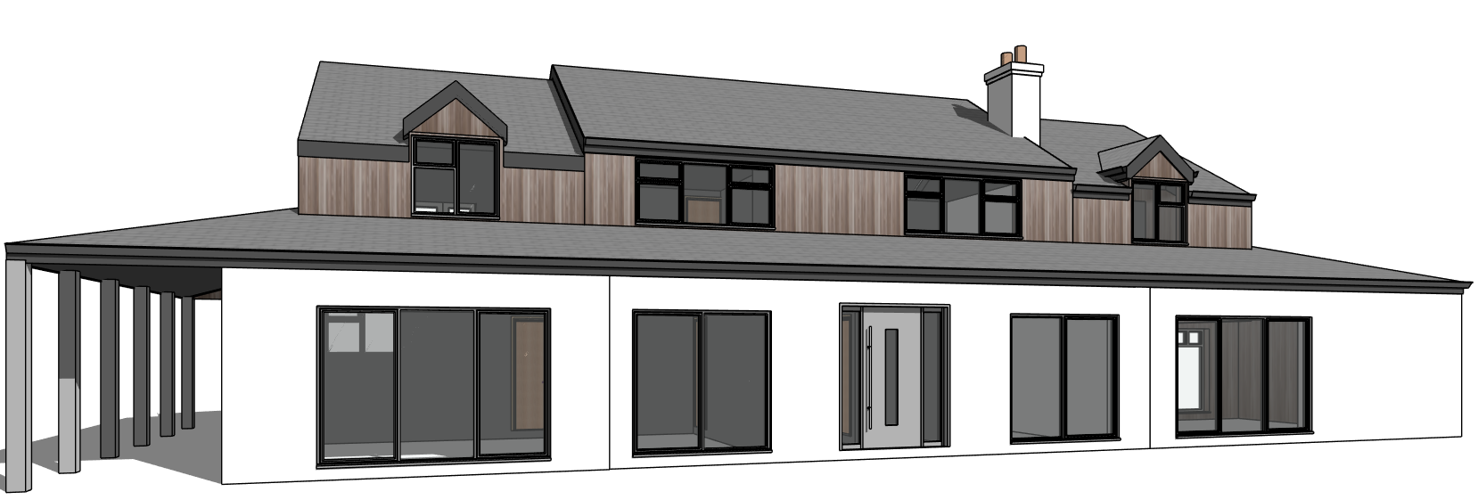 wide angle shot do not change the line structures or window styles just enhance the lights grey weathered larch cladding and the crisp white render and the frames to doors and windows will be light grey sunny landscape background with a porsch 911 turbo on the driveway