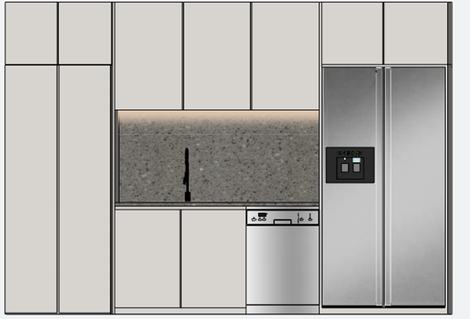 render with the same material and lighting wuth a modern finish the left cupboard is a full pocket door and also the shelf is just peach colour not wood the countertop is grey graphite make it lesser tecture and more material for the countertop